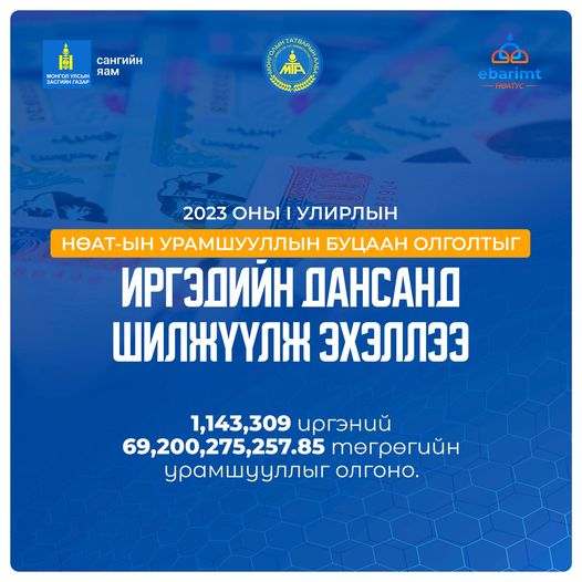 НӨАТ-ын урамшууллын буцаан олголтыг иргэдийн дансанд шилжүүлж эхэллээ. Татвар төлөгч 1,143,309 иргэнд 69.2 тэрбум төгрөгийн урамшуулал олгоно.