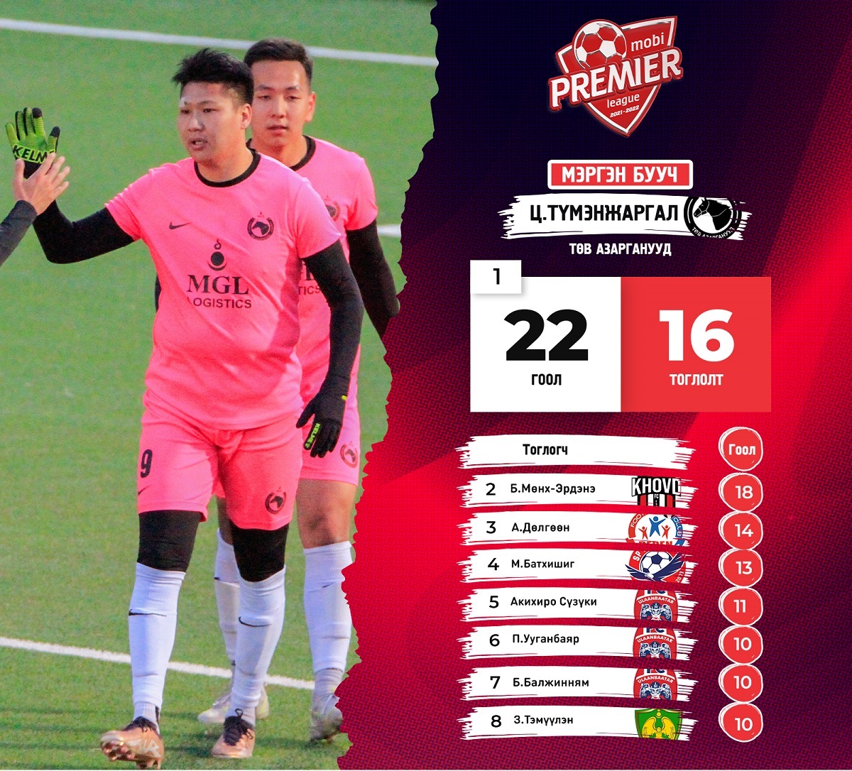 Төв Азарганууд клубийн довтлогч Ц.Түмэнжаргал 22 гоолтойгоор мэргэн буучдын жагсаалтыг тэргүүлж байна.