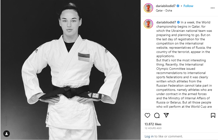 Олимпын хүрэл медальт, дэлхийн хошой аварга Дарья Белодед (57 кг) Instagram хуудсандаа “Долоо хоногийн дараа Катарт жүдо бөхийн ДАШТ эхлэх болно. Энэ тэмцээнд бид оролцохоор бэлтгэж байсан юм. Гэтэл тэмцээний мэдүүлэг өгөх сүүлийн өдөр алан хядагч Орос улсын тамирчдын нэр бүртгэлд гарч ирлээ. Гэхдээ хамгийн сонирхолтой нь энэ биш. ОУОХ-ноос саяхан Оросын тамирчдыг тэмцээнд оролцуулах нөхцөл тавихдаа арми, хүчний байгууллагад харьяалагддаг тамирчдыг оруулж болохгүй гэж ойлгомжтой заасан байгаа. Гэтэд ДАШТ-д оролцох орос жүдочид бүгд цэргийн албан хаагчид байна. Өдөр бүр украинчуудыг алан хядаж байгаа алан хядагч улсын цэргийн албан хаагчдыг олон улсын тэмцээнд оруулахыг хүлээн зөвшөөрч болохгүй” гэж бичжээ.