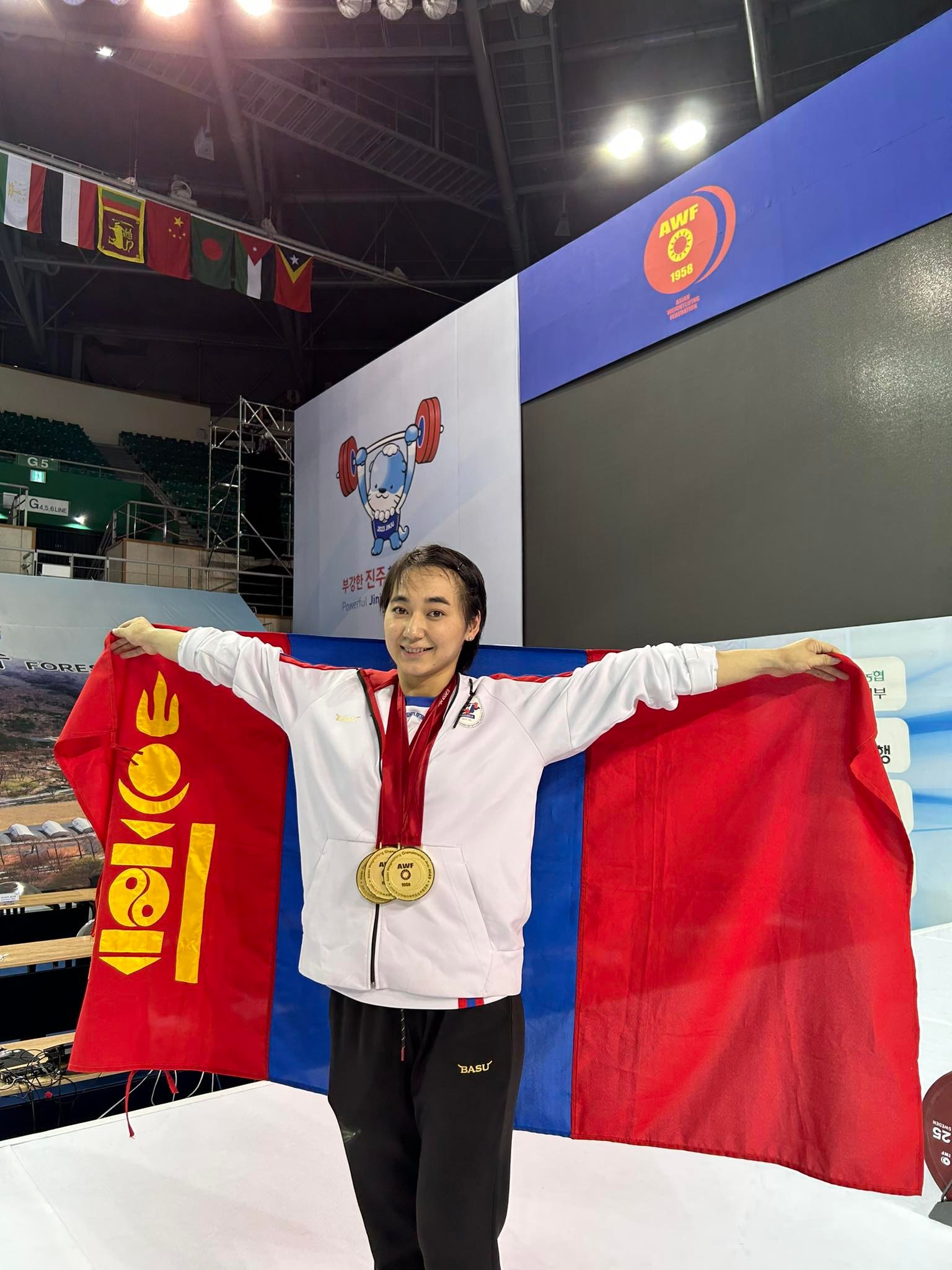Дөнгөж сая манай тамирчин огцом болон түлхэлттэй өргөлтийн төрөлд хоёуланд тэргүүлэн, алтан медаль хүртэж, нийлбэр дүнгээр мөн алт, нийт 3 шар медаль энгэртээ гялалзууллаа.