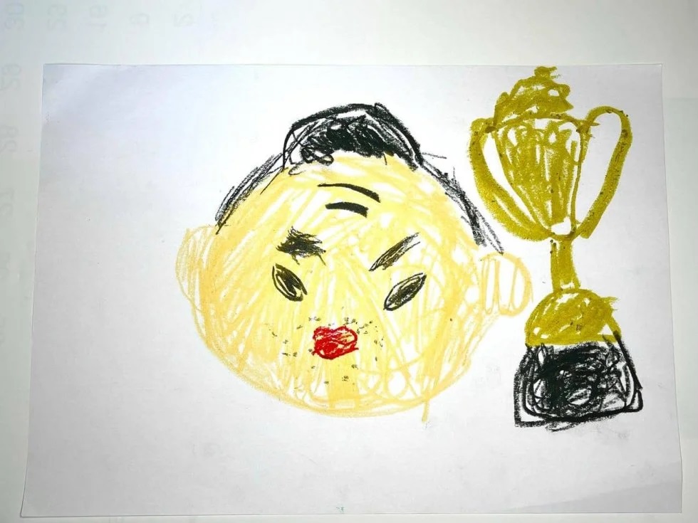 Тамаваши “Үнэхээр үнэтэй сайхан бэлэг байна. Өмнө нь дандаа л ээжийгээ зураад байдаг байсан юм. Анх удаа намайг зурлаа. Аавыгаа хоёр удаа дээд зиндаанд түрүүлсэн гэдгийг мэдэж байгаад нь баяртай байна. Гэрт байдаг Түрүү бөхийн цомын хуулбарыг харж байгаад зурж байсан юм. Намайг “Ууртай болон барилдах үедээ духан дээр нь 3 үрчлээс, инээж баярлахаар 2 үрчлээс гардаг” гэж хэлдэг болохоор энэ зураг инээж байгаа зураг минь байна. 3 настай дараах хүү минь тэмцээнд түрүүлэх гэж ойлгохгүй байгаа байгаа болохоор 3 дахь түрүүгээ авах гэж хичээх болно”