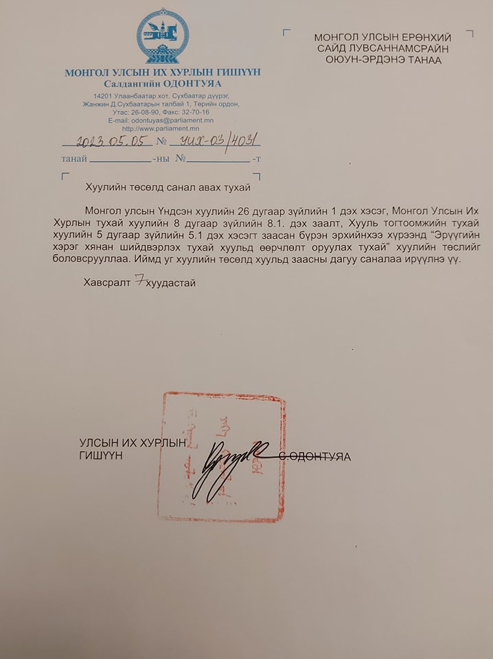 УИХ-ын гишүүн С.Одонтуяа эрүүгийн хэрэг хянан шийдвэрлэх тухай хуульд өөрчлөлт оруулах тухай хуулийн төслийг боловсруулан санал авахаар хүргүүлжээ. Ингэхдээ тэрбээр хуулийн төслийг боловсруулах явцад дараах мэдээллүүдийг үндэслэл болгон заалтуудыг тусгасан аж. Тодруулбал, НҮБ-ын Дур зоргоор саатуулах асуудал хариуцсан Ажлын хэсгийн урьдчилсан дүгнэлтэд манай улсад 2020-2021 онд хийгдсэн баривчлах ажиллагааны 98-99 хувь нь шүүхийн зөвшөөрөлгүй хийгдсэнийг онцолсон. Энэ байдал үнэн болохыг монгол улсын хүний эрхийн комиссын Монгол Улс дахь хүний эрх, эрх чөлөөний төлөв байдлын 22 дахь илтгэлээр баталгаажуулсан.