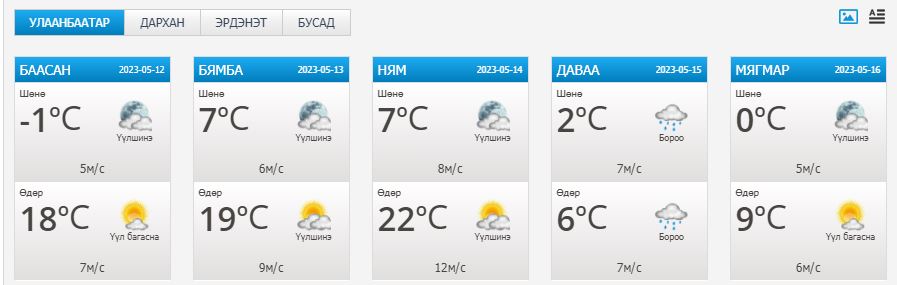 13, 14-нд нутгийн хойд хэсгээр, 15-нд баруун болон төвийн аймгуудын ихэнх нутгаар, 16-нд нутгийн зарим газраар бороо, нойтон цас орно. Салхи 13-нд нутгийн зарим газраар, 14-нд ихэнх нутгаар, 15, 16-нд говь, тал, хээрийн нутгаар секундэд 15-17 метр хүрч ширүүсэж, шороон шуурга шуурна.