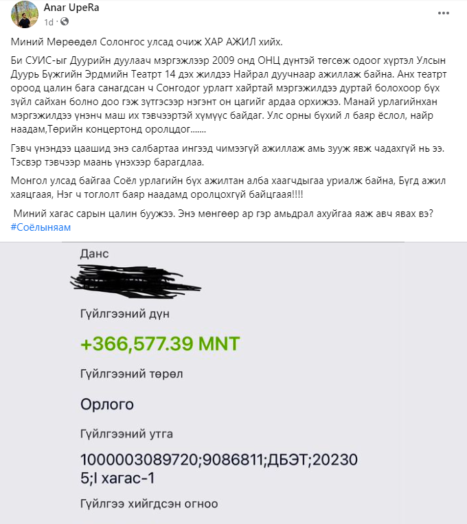 Тэр дундаа соёл, урлагийн салбарт ажиллаж байгаа уран бүтээлчид өөрсдийн цалин, урамшууллын тухай бодит байдлыг олон нийтэд нээлттэй мэдээлж эхэлжээ. Өмнө нь эмч, багш нар энэ асуудлыг хөндөж, ажил хаялт хүртэл хийж байсан. Харин энэ удаад соёл, урлагийн салбарт ажиллаж буй уран бүтээлчид цалин нэмэгдэхгүй бол Төрийн наадмын нээлт, хаалтад оролцохгүй гэдгээ мэдэгдлээ.