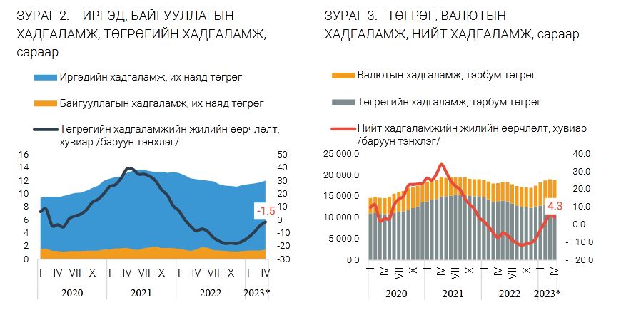 Төгрөгийн хадгаламж дөрөвдүгээр сарын эцэст 13.5 их наяд төгрөг болж, өмнөх сараас 424.8 тэрбум төгрөг буюу 3.2 хувиар өсөж, өмнөх оны мөн үеэс 206.1 тэрбум төгрөг буюу 1.5 хувиар буурчээ.