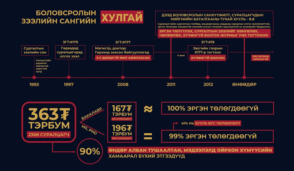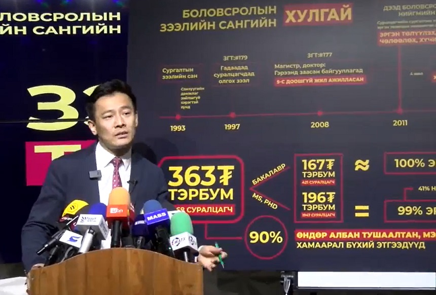 Магистр, докторын 1947 суралцагчид олгосон 196 тэрбум төгрөгийн зээлээс 99 хувь нь эргэн төлөгдөөгүй, үүний 41 хувь нь хууль бус буюу сайдын тушаалаар чөлөөлөгдсөн байна.