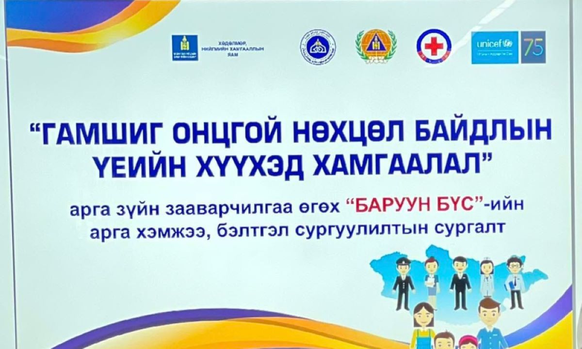Энэхүү стандартын сургалтыг ХНХЯ-наас өнгөрсөн онд зохион байгуулсан байдаг. Тус үйл ажиллагааны үргэлжлэл болгож Гэр бүл, хүүхэд, залуучуудын хөгжлийн газраас НҮБ-ын Хүүхдийн сангийн дэмжлэгтэйгээр Баян-Өлгий, Өмнөговь аймгуудад “Гамшиг онцгой нөхцөл байдлын үеийн хүүхэд хамгаалал” арга зүйн зааварчилгаа өгөх арга хэмжээ, бэлтгэл сургуулилтыг зохион байгуулж байна.