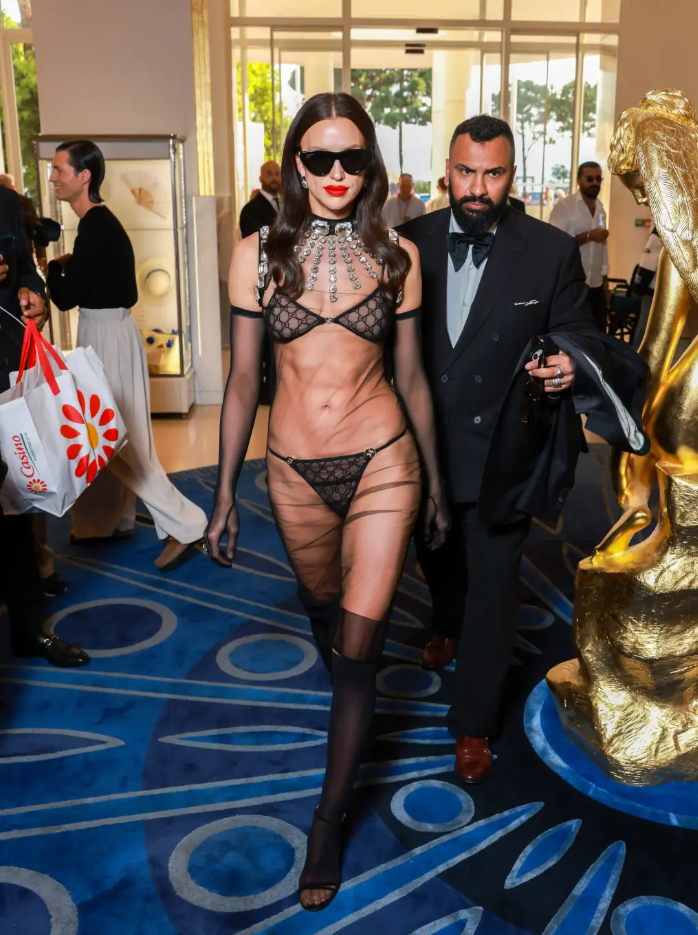 Супермодель Ирина Шейк даваа гарагт Каннын кино наадамд хүрэлцэн иржээ. Нэвт гэрэлтэх торон даашинзтай ирсэн тэрээр өвдөг давсан урт шилэн оймс болон бээлий өмсжээ.