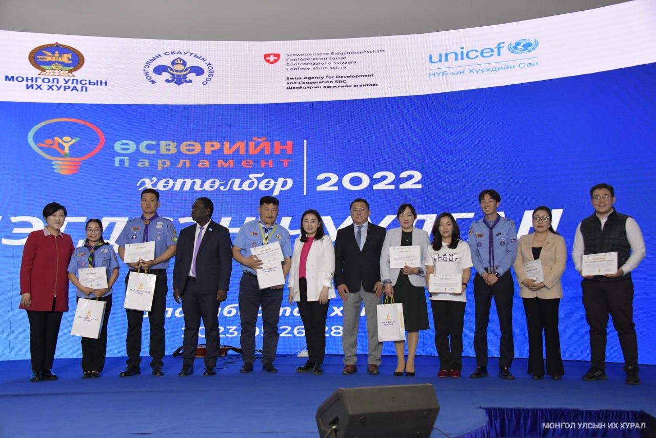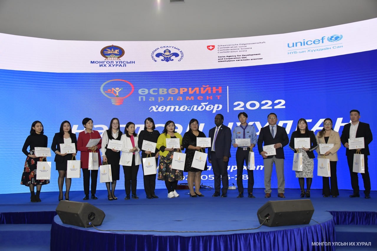“Өсвөрийн парламент-2022” хөтөлбөр хаалтаа хийж, оролцогч хүүхдүүд, багш нар, хамтран ажилласан байгууллагуудад батламж гардуулан ёслолын ажиллагаа өнөөдөр (2023.05.28) Чингис хаан Үндэсний музейд боллоо.