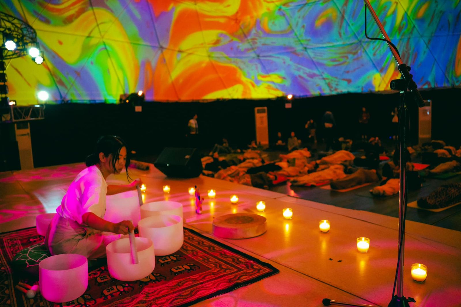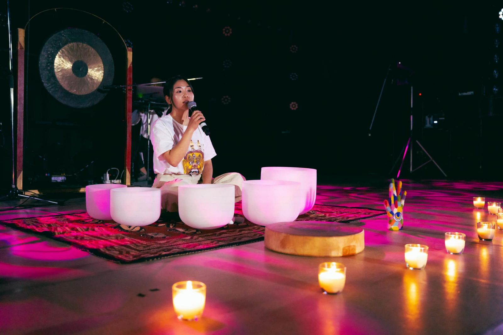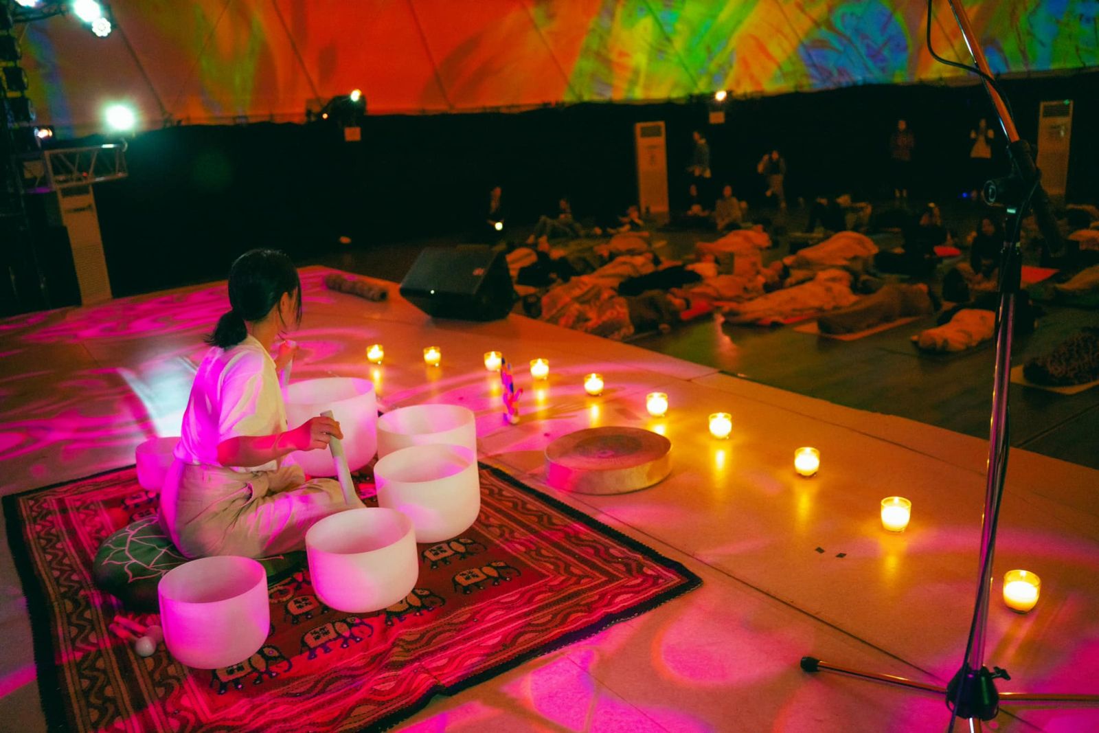 Хөгжимт бясалгалыг дуут аяга, хэл хуур, вибрафон, гонг, калимба, салхин хонх, цохивор хөгжим, хонх зэрэг хөгжмийн зэмсгүүдийг ашиглан хөгжимчдийн хамт саунд терапиcт Б.Тэлмүүн удирдана явуулжээ. Мөн уран бүтээлч Арюна Булутовагийн 360' медиа арт бүтээл болон уран бүтээлч Ц.Дэлгэрдалайгийн саунд арт бүтээлийг толилуулж, үзэгчдийн сэтгэлийг анагаалаа.