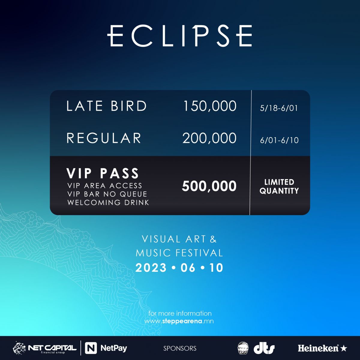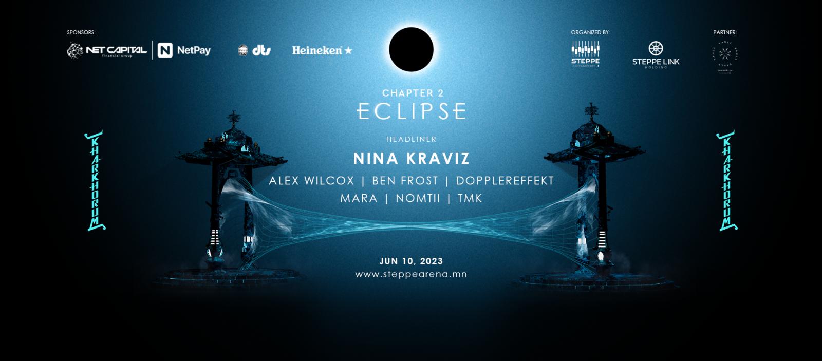 "Kharkhorum “ECLIPSE” Visual Art & Music Festival" ирэх зургаадугаар сарын 10-нд "Steppe Arena"-д зохион байгуулагдана. Тасалбарыг Steppe Arena веб хуудсанд хандан худалдан авах боломжтой.