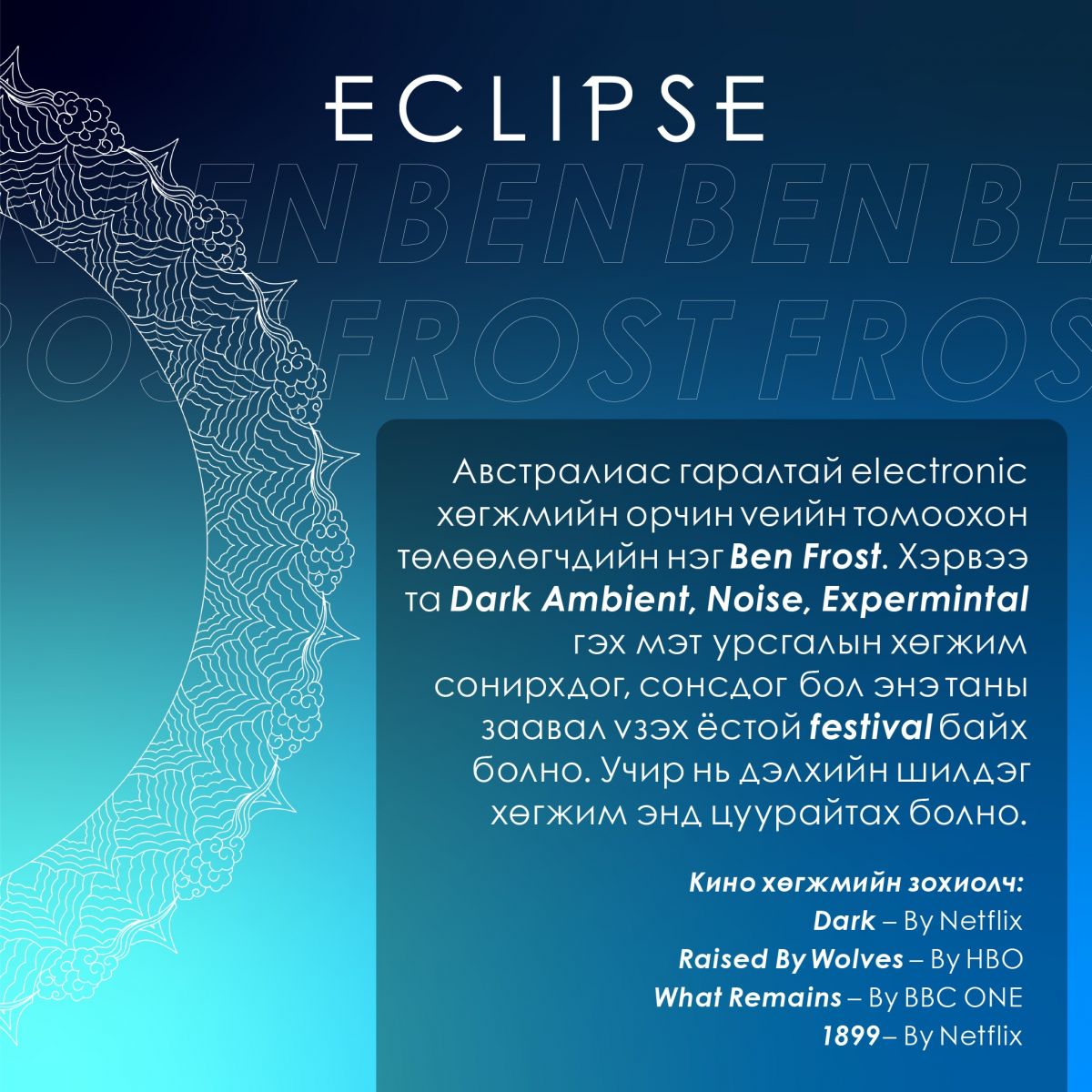 Түүнээс гадна домогт Ben Frost, Dopplereffekt, Alex Wilcox нарыг урин тоглуулж байгааг дуулгахад таатай байна. Мөн Монголын шилдэг DJ Mara b2b TMK, NOMTII нар оролцох болно.