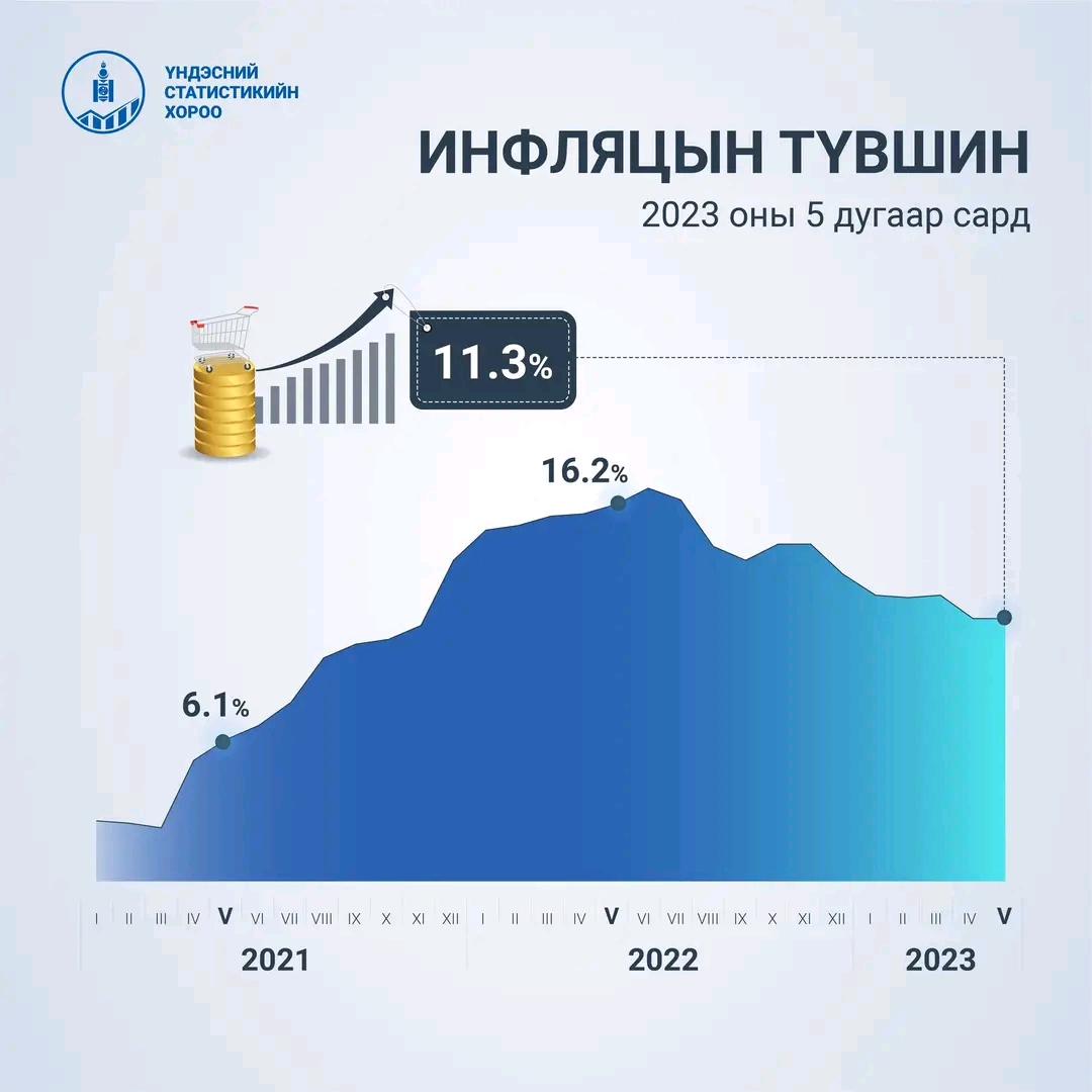 Инфляц буюу хэрэглээний бараа, үйлчилгээний үнэ энэ оны тавдугаар сард улсын хэмжээнд өмнөх оны мөн үеэс 11.3 хувь, өмнөх оны эцсээс 6.1 хувь, өмнөх сараас 1.3 хувиар өссөн байна.