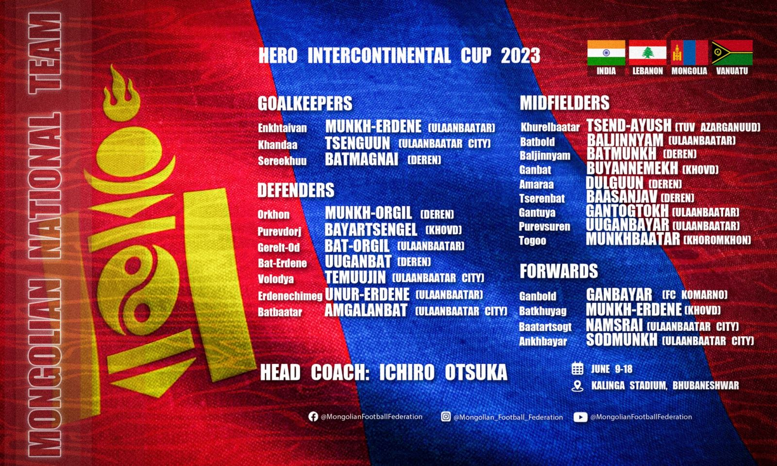 ОУХБХ-ны өдрүүдээр (FIFA DAYS) Энэтхэг улсад зохион байгуулагдах "Hero Intercontinental Cup 2023" тэмцээнд оролцох Монголын Үндэсний шигшээ багийн бүрэлдэхүүн зарлагдлаа.