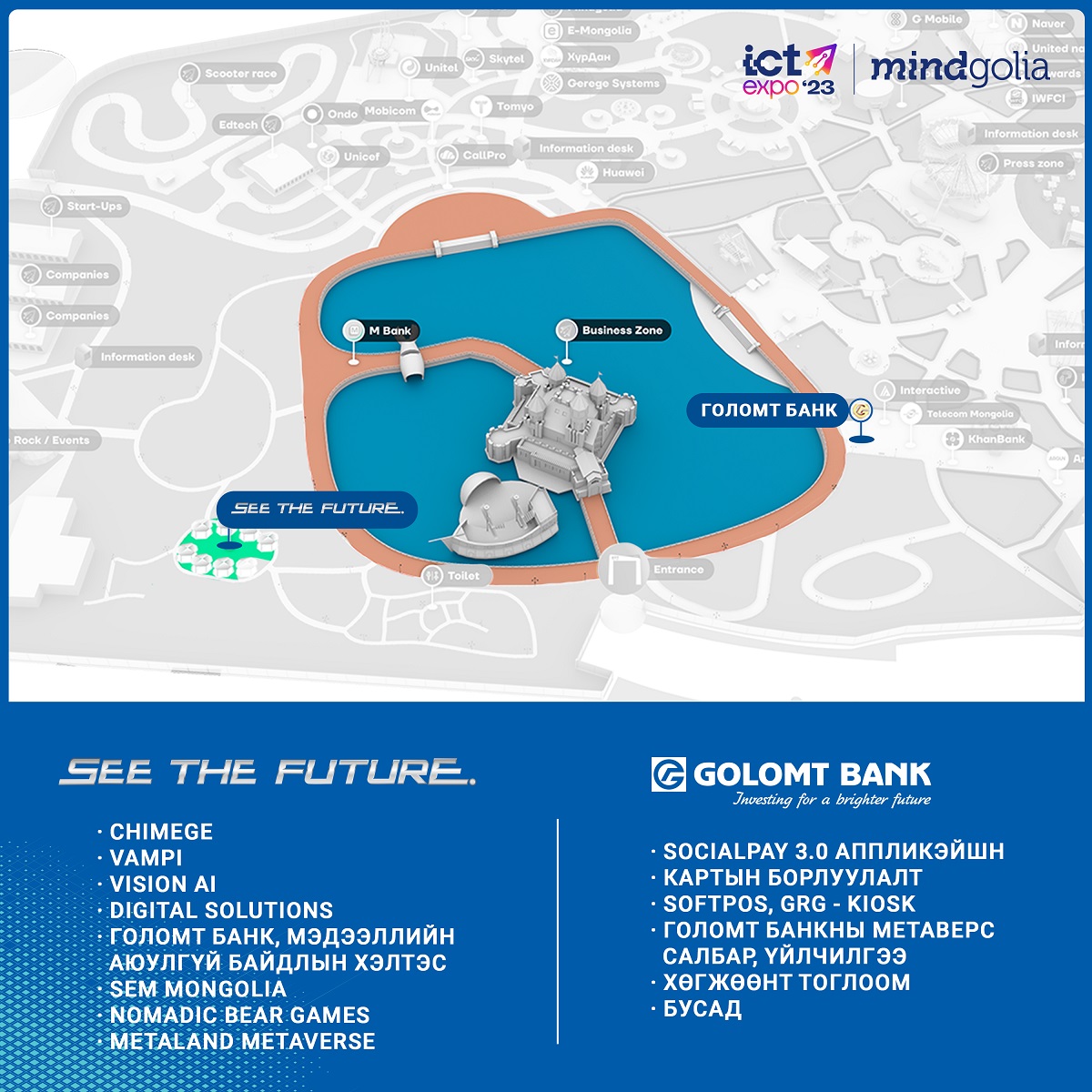 Мөн SEE THE FUTURE хэсгээр зочлон дараах байгууллагуудын дижитал үйлчилгээтэй танилцаж, мэдээлэл авах боломжтой.
