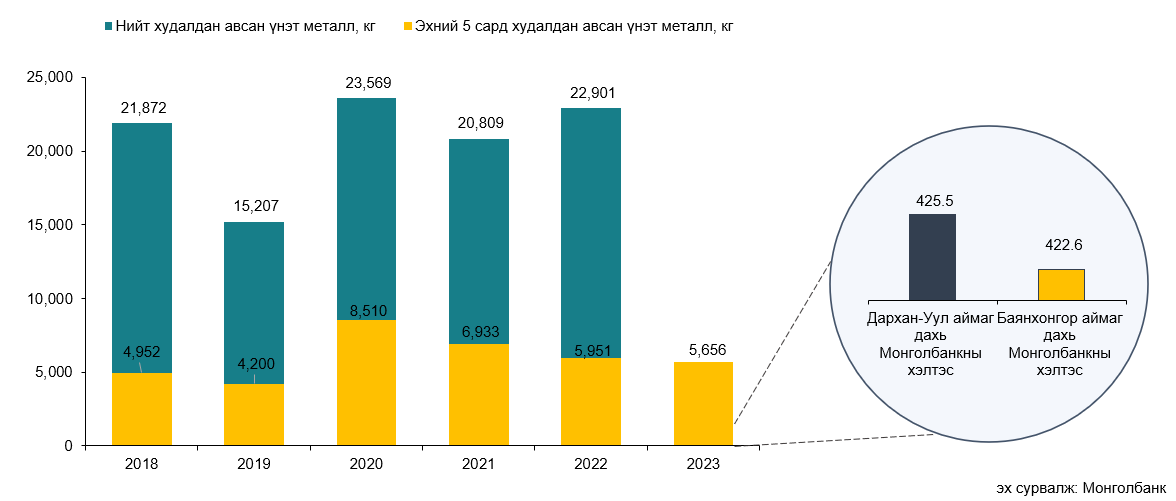 Оны эхнээс өссөн дүнгээр Дархан-Уул аймаг дахь Монголбанкны хэлтэс 425.5 кг, Баянхонгор аймаг дахь Монголбанкны хэлтэс 422.6 кг үнэт металл тус тус худалдан аваад байна.