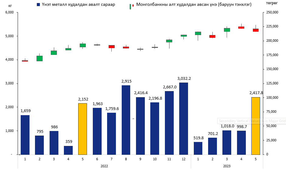 Монголбанк энэ оны тавдугаар сард 2,417.8 кг үнэт металл худалдан авсан байна. Ингэснээр оны эхнээс хойш нийт 5.6 тонн үнэт металл худалдан авчээ.