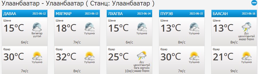 Улаанбаатар хот орчмын 7 хоногийн цаг агаарын урьдчилсан төлөв