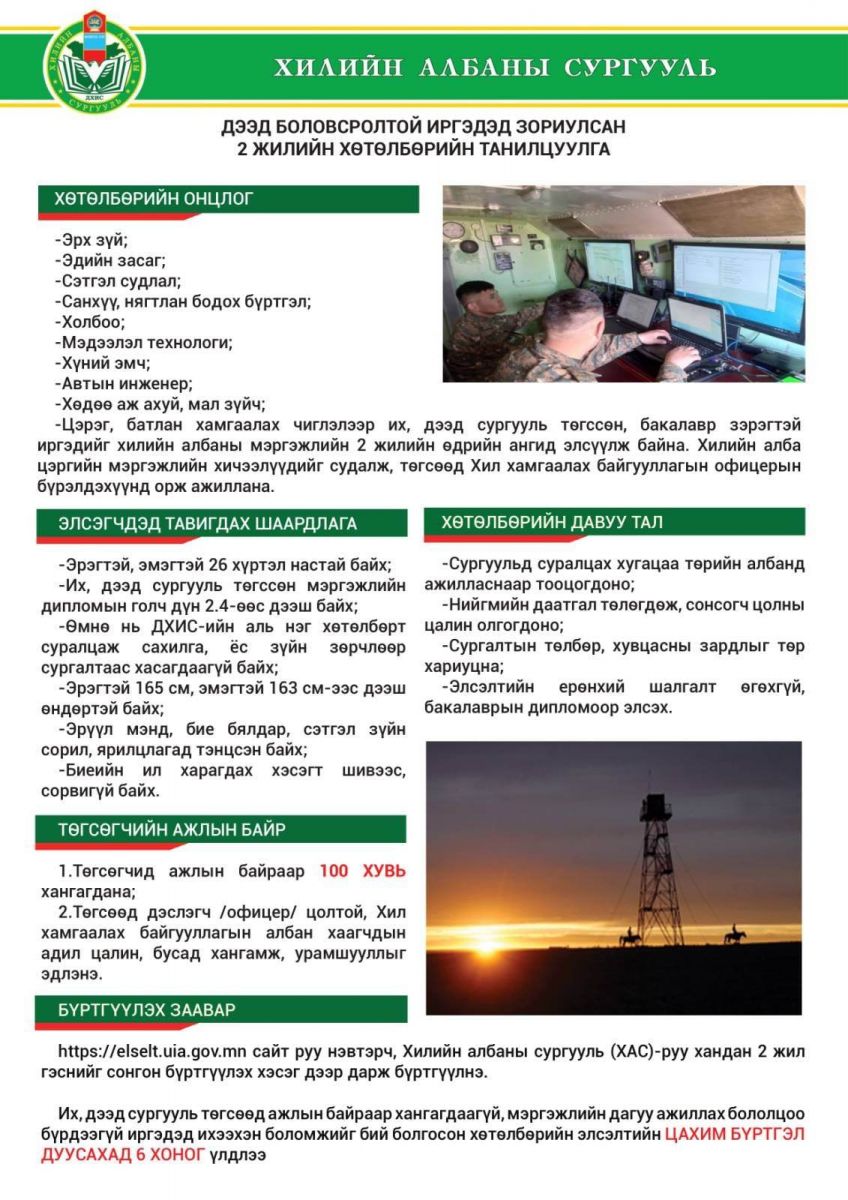 ДХИС-ийн Хилийн албаны сургуулиас 2023-2024 оны хичээлийн жилд элсэлт авах мэргэжлээ танилцууллаа. Элсэлтийн бүртгэл энэ сарын 18-ны 17.00 цаг хүртэл явагдана.