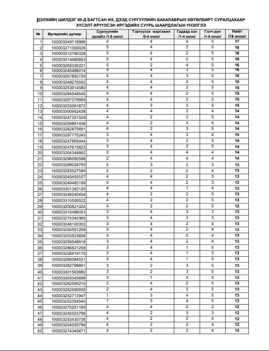 БШУЯ-аас дэлхийн шилдэг 50-д эрэмбэлэгдсэн их, дээд сургуулийн бакалаврын үндсэн хөтөлбөрт суралцах эрх авч, 2023 оны сонгон шалгаруулалтад оролцож суурь шаардлага хангасан иргэдийн үнэлгээг танилцууллаа.
