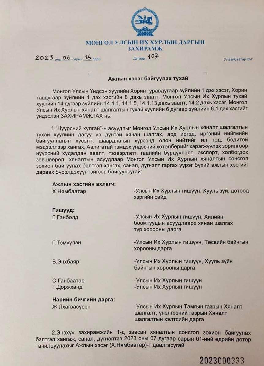 УИХ-ын дарга “Нүүрсний хулгайн“ асуудлаарх өмнөх түр хороог татан буулгаж, Х.Нямбаатараар ахлуулсан шинэ ажлын хэсэг байгуулжээ.