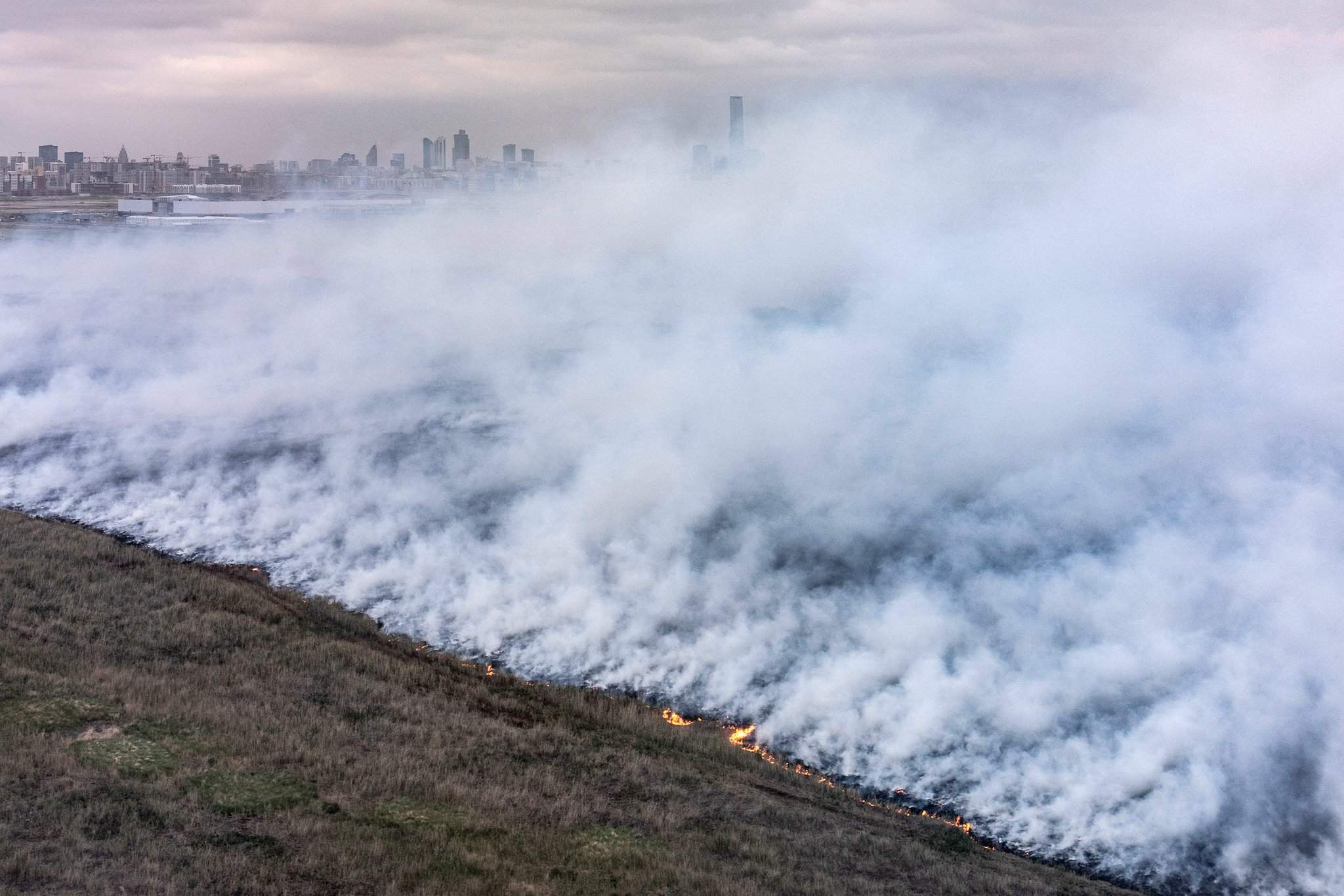 Казахстаны Астана хотод ой хээрийн түймэр дөхөж ирлээ. Хот тэр чигээрээ утаанд хучигдаад байна. Фото: REUTERS/Turar Kazangapov