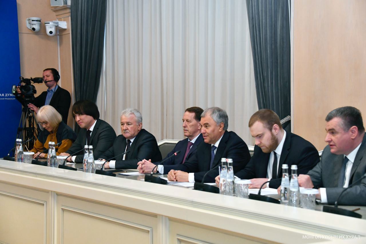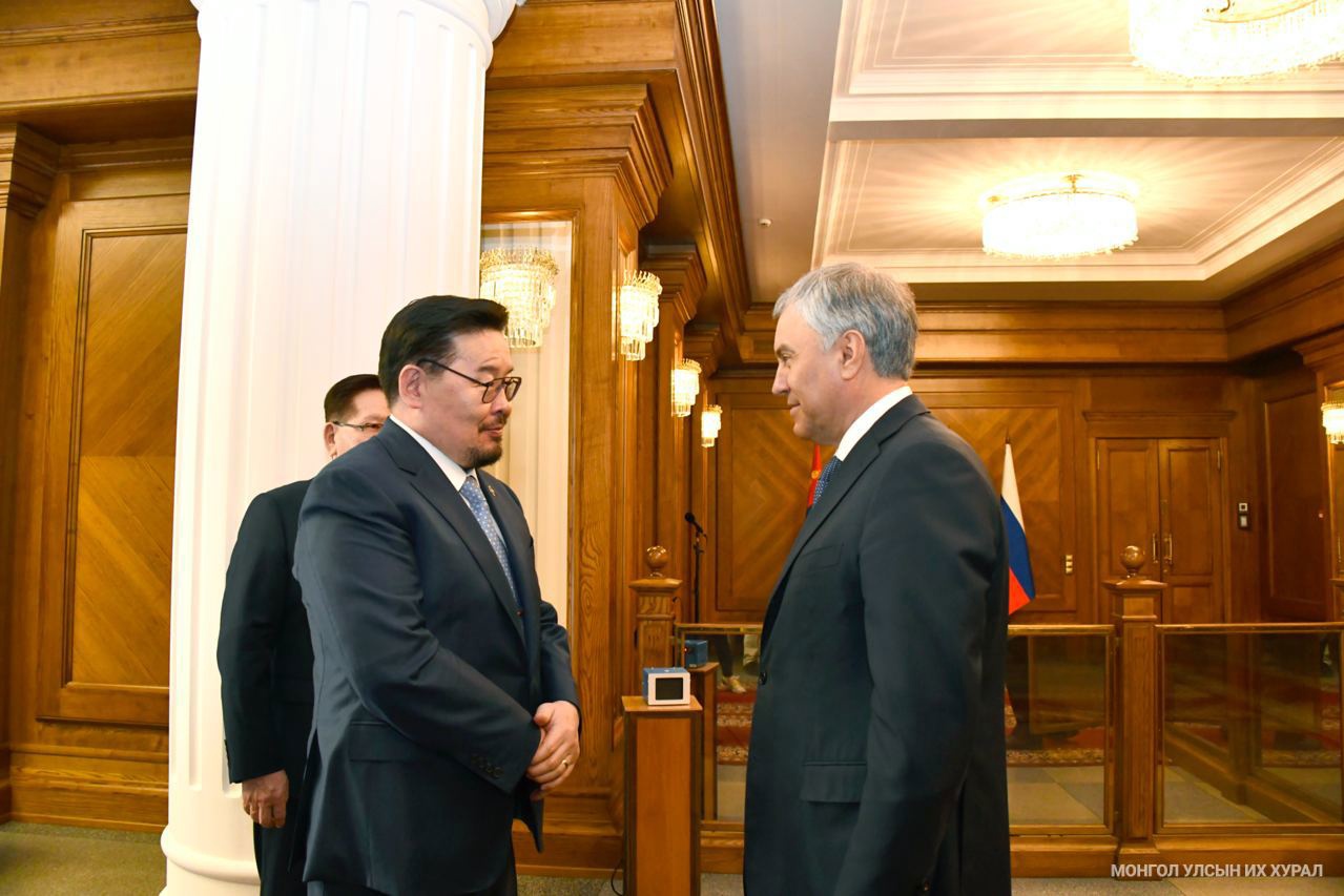 ОХУ-ын Холбооны Хурлын Төрийн Думын дарга В.В.Володин уулзалтын эхэнд Монгол, Оросын найрамдал он цагийн шалгуурыг даван туулсныг онцлоод, өдгөө хоёр орны парламентын гишүүд хамтын ажиллагаанд тулгамдаж буй асуудлуудыг шийдвэрлэхэд онцгойлон анхаарч ажиллах нь зүйтэй хэмээсэн.
