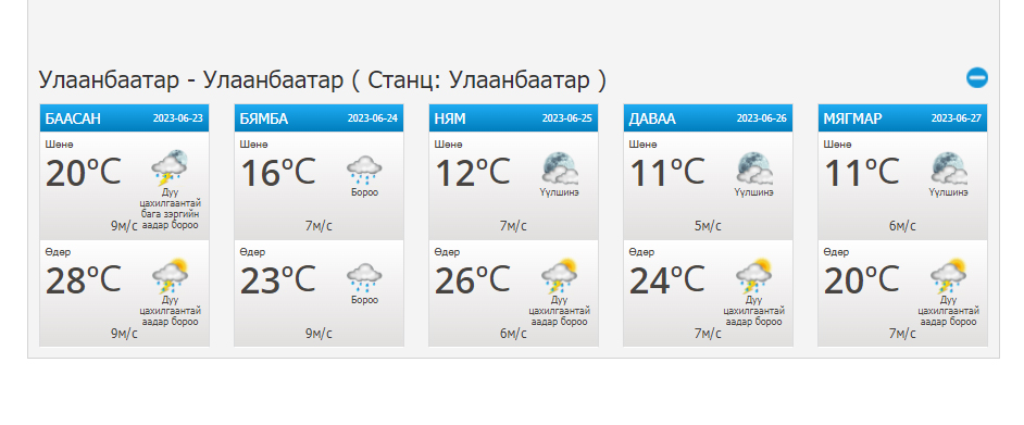 Салхи: Ихэнх нутгаар секундэд 5-10 метр, нутгийн зарим газраар борооны өмнө түр зуур ширүүснэ.