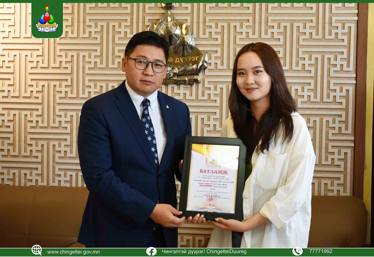 Чингэлтэй дүүргийн Засаг дарга Н.Батсүмбэрэл Элсэлтийн ерөнхий шалгалтад 800 оноо авч амжилт үзүүлсэн сурагчид, бэлдсэн багш нарыг хүлээн авч уулзан баяр хүргэлээ.
