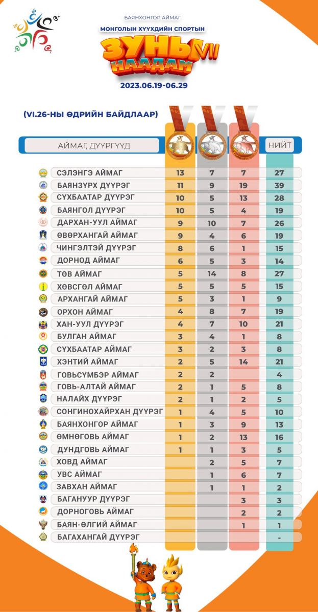Өнөөдрийн байдлаар медалийнхаа тоогоор Сэлэнгэ аймаг тэргүүлж байгаа бол Баян-Өлгий аймаг болон Багахангай дүүргийнхэн сүүл мушгиж байна.