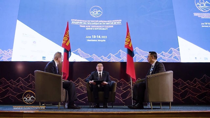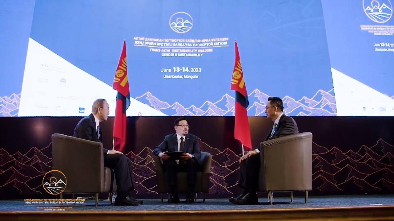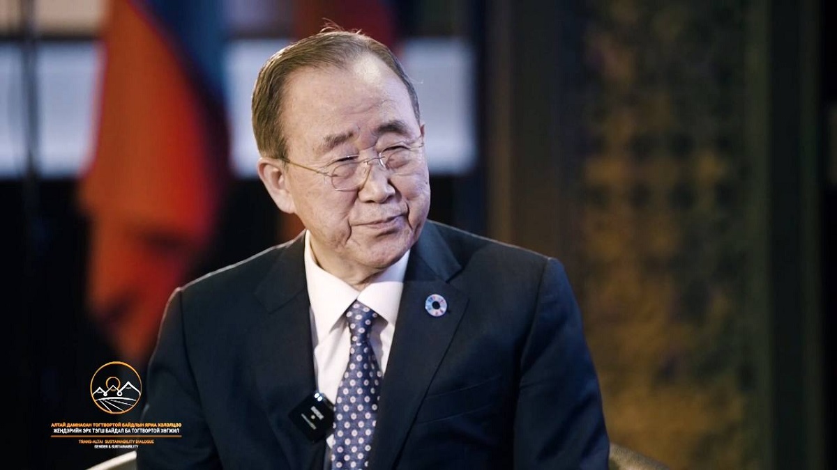 Бан Ги Мун:  Хамгийн их санаа зовоож байгаа асуудал бол тасралгүй явагдаж буй уур амьсгалтын өөрчлөлтийн нөлөө юм. Тийм ч учраас “Алтай дамнасан тогтвортой байдлын яриа хэлэлцээ” чуулга уулзалт бүс нутгийн улс орнуудад уур амьсгалын өөрчлөлтийн эсрэг хэрэгжүүлэх арга хэмжээгээ түргэсгэхэд нь хэрхэн тусалж чадах, мөн тогтвортой хөгжлийн 17 зорилтыг хэрэгжүүлэхэд чиглэгдэх ёстой.