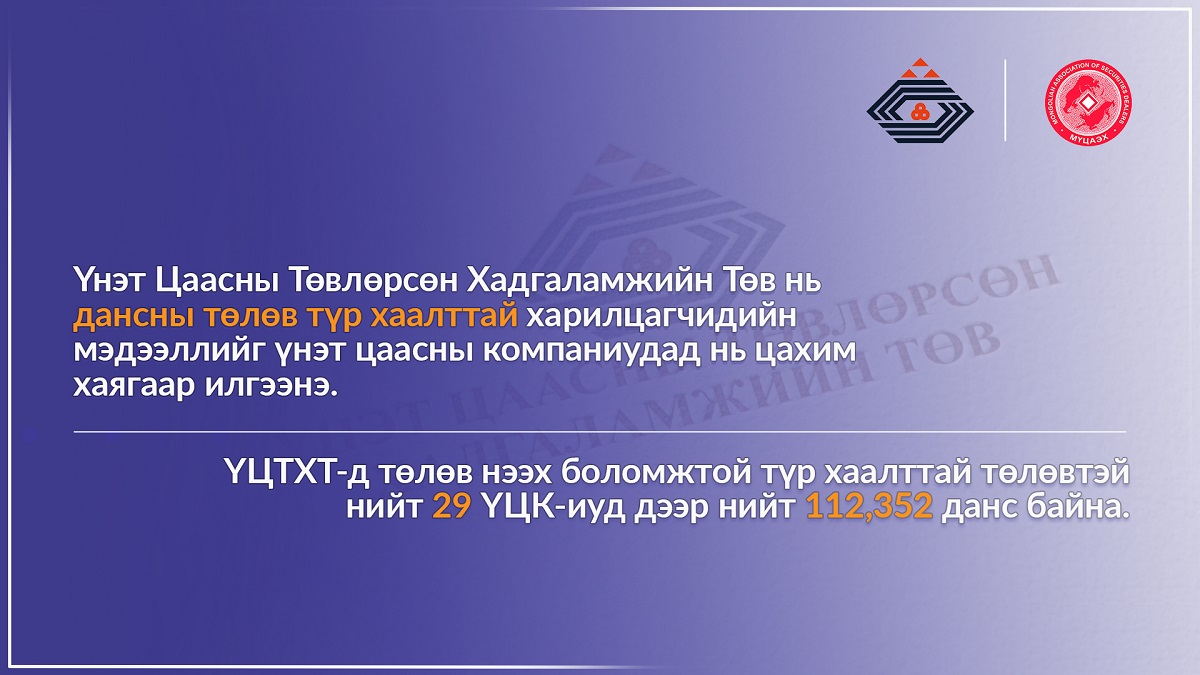 Иймд ҮЦК-иуд албан ёсны цахим хаягаа шалган тус жагсаалтыг үндэслэн ажиллана уу. ҮЦТХТ-д төлөв нээх боломжтой түр хаалттай төлөвтэй нийт 29 ҮЦК-иуд дээр нийт 112,352 данс байна гэж Монголын Үнэт Цаасны Арилжаа Эрхлэгчдийн Холбооноос мэдээллээ.