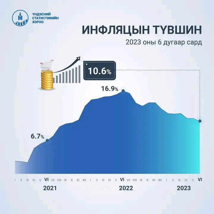 Хэрэглээний бараа, үйлчилгээний үнэ 2023 оны зургадугаар сард улсын хэмжээнд өмнөх оны мөн үеэс 10.6 хувь, өмнөх оны эцсээс 7.1 хувь, өмнөх сараас 1.0 хувиар өссөн гэж ҮСХ-ноос мэдээллээ.
