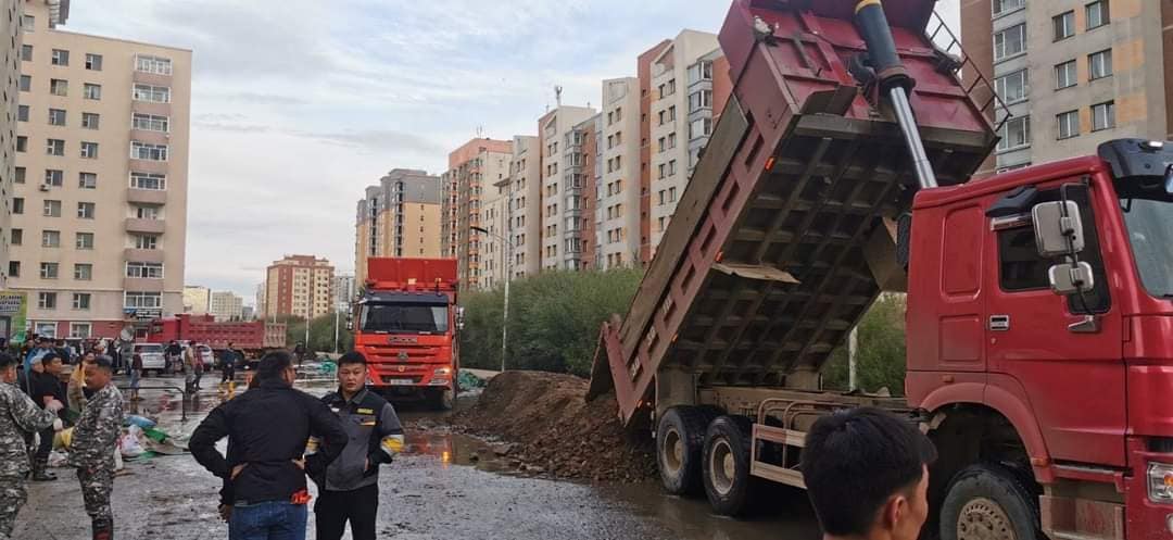 Нийслэлийн онцгой байдлын комиссоос ирүүлсэн мэдээллийн дагуу “Улаанбаатар буян” ХХК-ийн урд S.Outlet дэлгүүр, Сүхбаатар дүүргийн 15 дугаар хорооны нутаг Дамбадаржаа орчим, “Алтай” хотхоны орчимд элс, шороо хайрга асгуулахаар ХӨСҮТ-ийн ойролцоогоос, Дүнжингарав худалдааны төвийн дэргэдэх Соёолж төв, Сансарын И-мартын хажууд үйл ажиллагаа явуулж байгаа барилгын талбайн хашаанаас элс, шороог авч, үерийн аюултай бүсэд хүргэх ажлыг зохион байгуулан ажиллаж байна. Мөн эдгээр газруудад БХБЯ, БХТ, “ТОСК” ТӨХХК-ийн нийт 5 албан хаагч 3 байршилд зохион байгуулалт хийн ажиллаж байна. Тодруулбал, “Улаанбаатар буян” ХХК-ийн урдах S.Outlet дэлгүүр орчим үерийн далангийн хамгаалалтад "Ногоон нуур 1008 айлын орон сууц төсөл"-ийн талбайгаас 3-4, “Эсэн трейд” /Эко констракшн/-аас 2, “Номт” ХХК-иас 1, "Альтернатив" ХХК-иас 2 машин, нэг эксковатор ашиглан “Их наяд” ХХК-ийн хашаанаас шороо зөөх ажлыг шуурхай гүйцэтгэж байна.