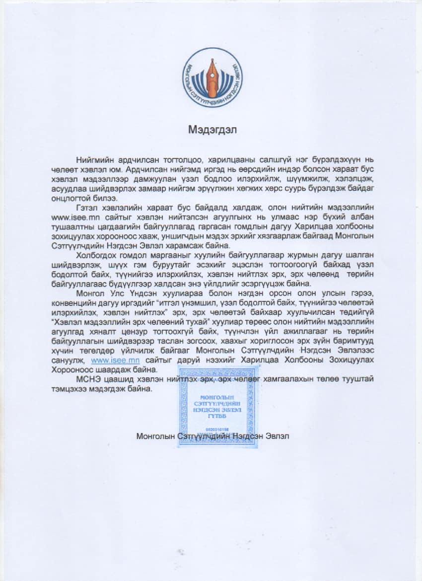 Монгол Улс Үндсэн хуулиараа болон нэгдэн орсон олон улсын гэрээ, конвенцийн дагуу иргэдийг “итгэл үнэмшил, үзэл бодолтой байх, түүнийгээ чөлөөтэй илэрхийлэх, хэвлэн нийтлэх” эрх, эрх чөлөөтэй байхаар хуульчилсан төдийгүй “Хэвлэл мэдээллийн эрх чөлөөний тухай” хуулиар төрөөс олон нийтийн мэдээллийн агуулгад хяналт цензур тогтоохгүй байх, түүнчлэн үйл ажиллагааг нь төрийн байгууллагын шийдвэрээр таслан зогсоох, хаахыг хориглосон эрх зүйн баримтууд хүчин төгөлдөр үйлчилж байгааг Монголын Сэтгүүлчдийн Нэгдсэн Эвлэлээс сануулж, www.isee.mn сайтыг даруй нээхийг Харилцаа Холбооны Зохицуулах Хорооноос шаардаж байна.