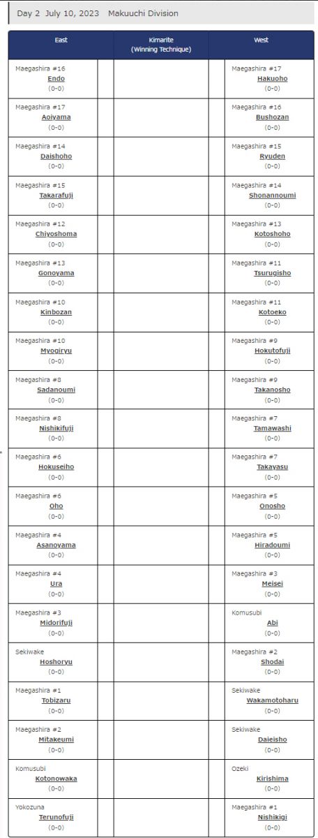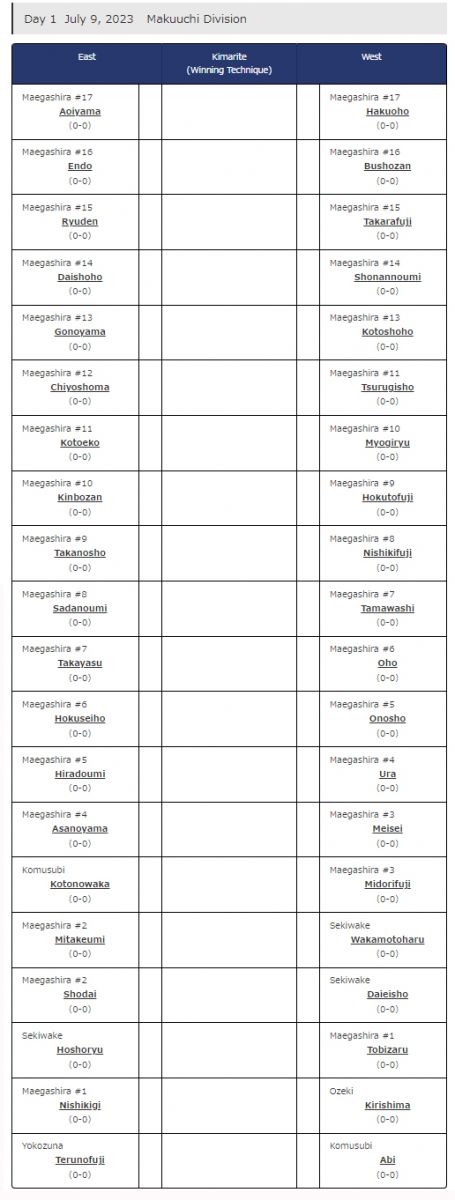 Зүүний магнайд босох ёкозүна Тэрүнофүжи Г.Ган-Эрдэнэтэй эхний өдөр Абитай, шинэ озэки Киришима Б.Лхагвасүрэн Нишигикитэй, Хоошёорюү С.Бямбасүрэн Тобизарүтай оноолт таарчээ. Та бүхэн оноолтыг дороос харна уу.