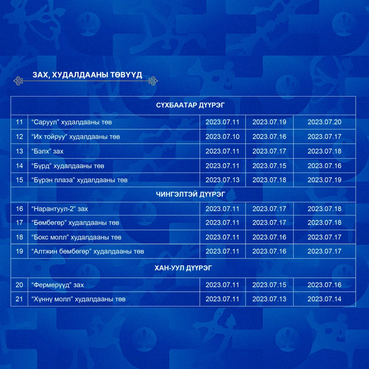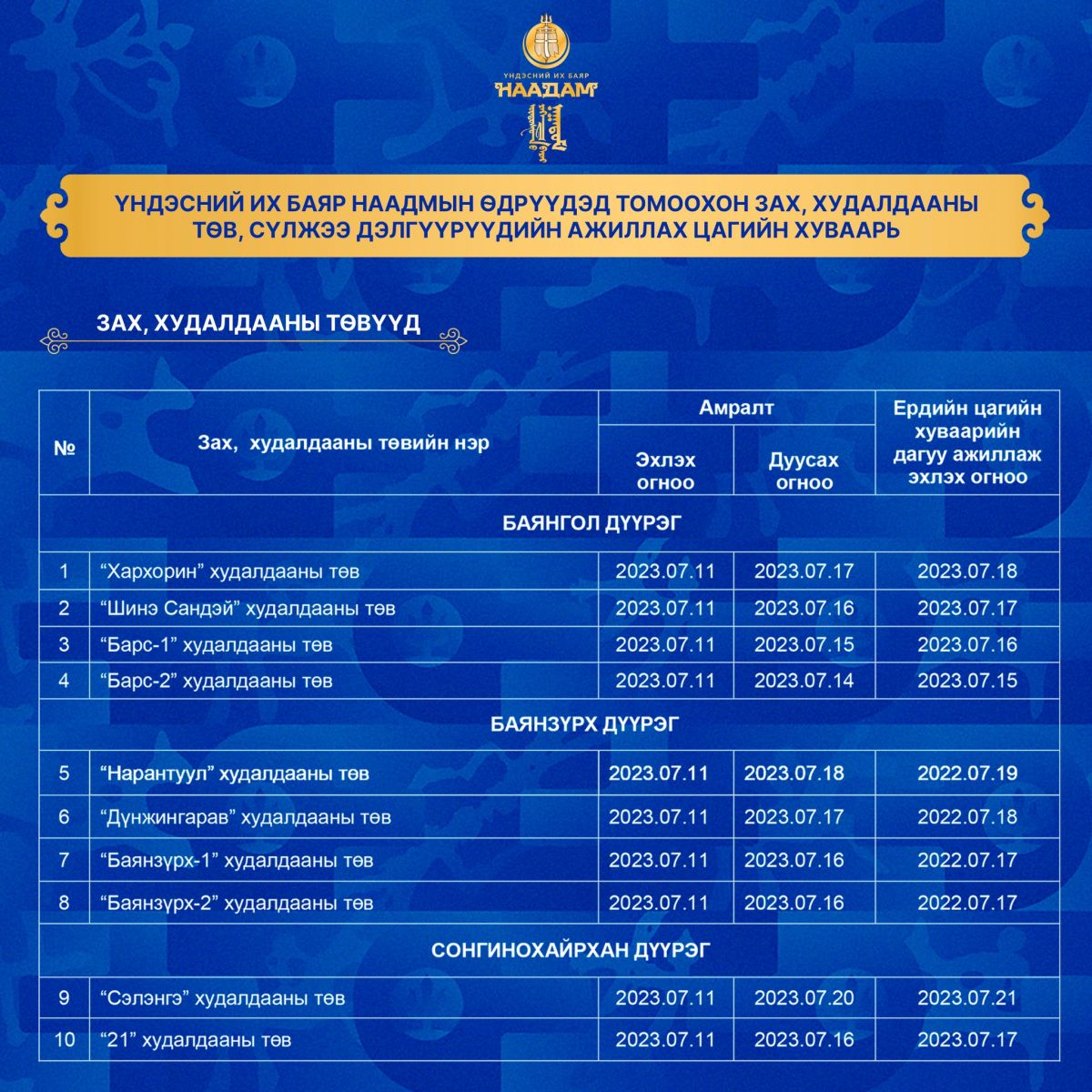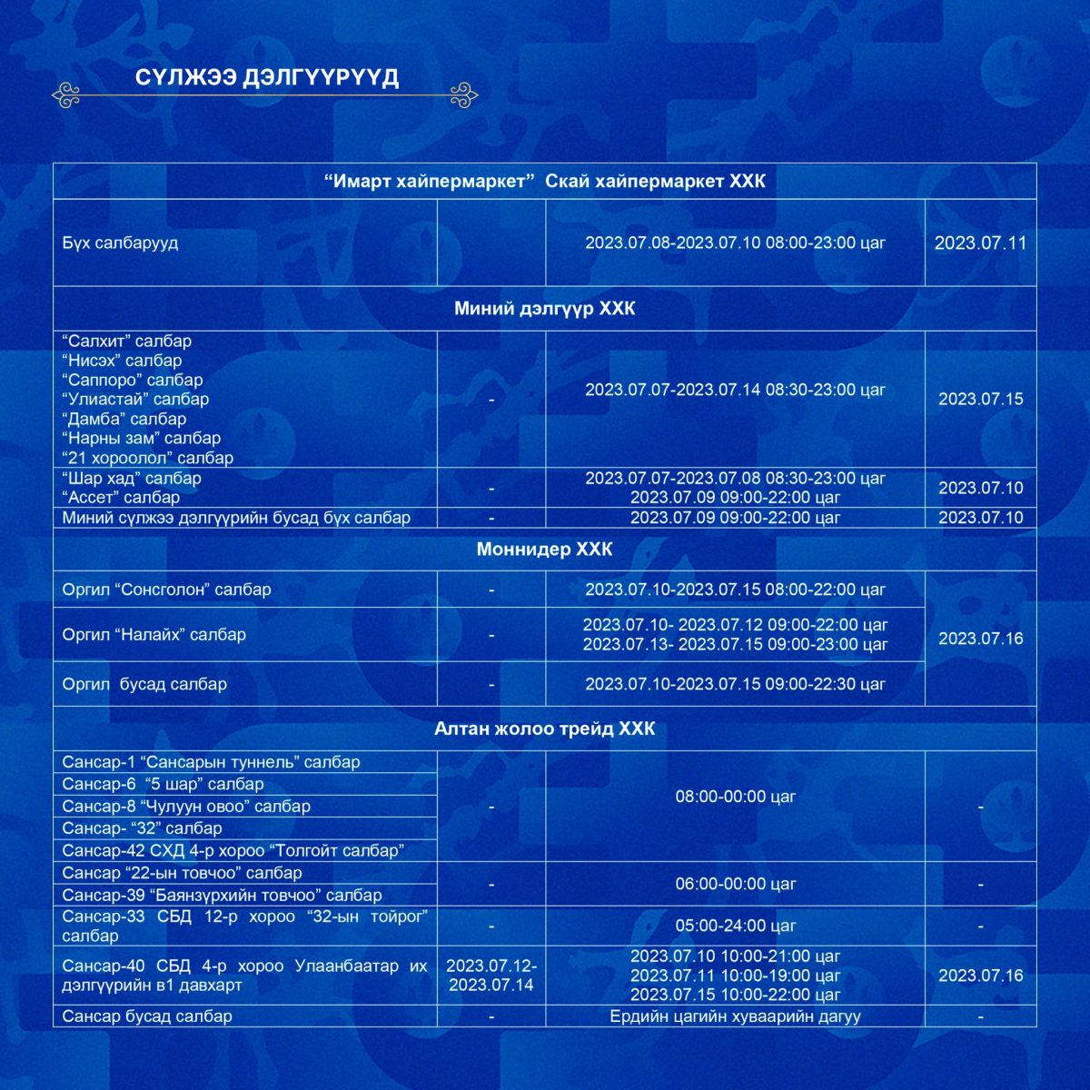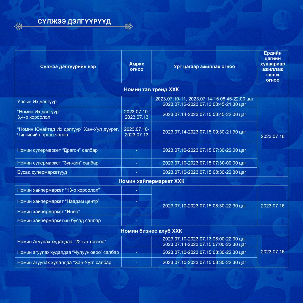 Үндэсний их баяр наадмын өдрүүдэд томоохон зах, худалдааны төв, сүлжээ дэлгүүрүүдийн ажиллах цагийн хуваарийг танилцуулъя.