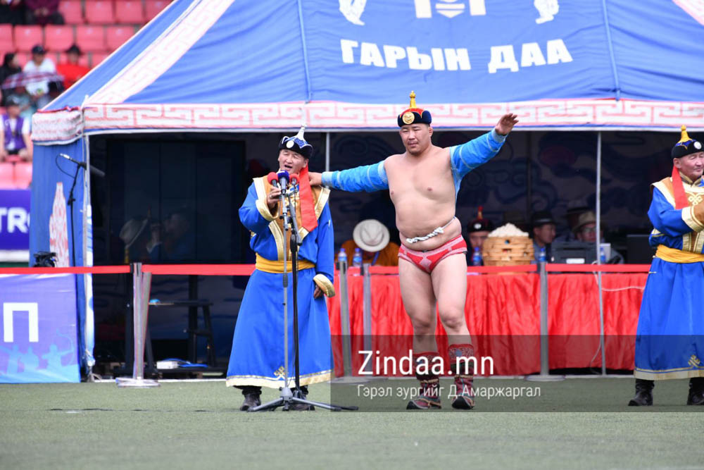 Архангай аймгийн Цэнхэр сумын харьяат, Улсын гарьд М.Бадарч долоогийн даваанд Архангай аймгийн Хашаат сумын харьяат, аймгийн арслан С.Сүхбатыг амлаж, Ховд аймгийн Чандмань сумын харьяат, Улсын заан Б.Пүрэвсайхан, Өвөрхангай аймгийн Төгрөг сумын харьяат, Улсын харцага Ц.Бямба-Отгон нар тунан барилдлаа.