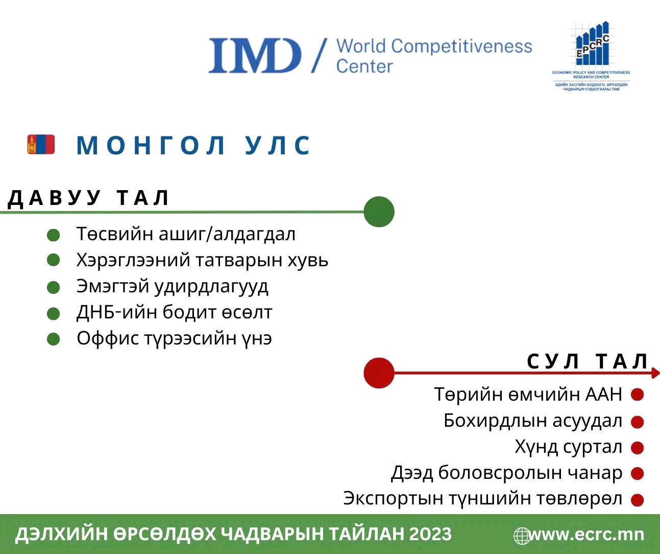 Өрсөлдөх чадварын тайланд Монгол Улсын давуу тал болон сул талыг дараах байдлаар тодорхойлжээ.