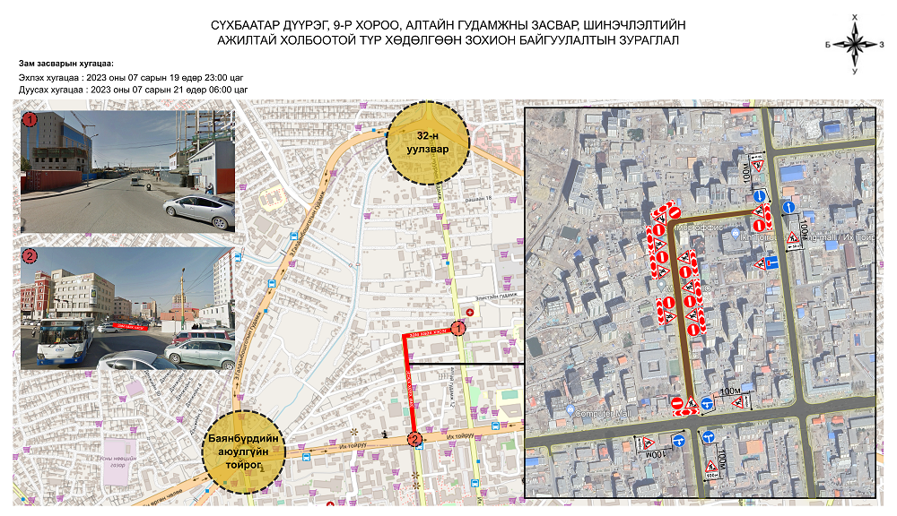 Сүхбаатар дүүргийн 9 дүгээр хороо, Алтайн гудамж буюу Дөлгөөн нуурын зүүн урд уулзвараас Ногоон нуурын гудамж хүртэлх авто замын хөдөлгөөнийг хязгаарлаж, засварын ажил гүйцэтгэх гэж байна.