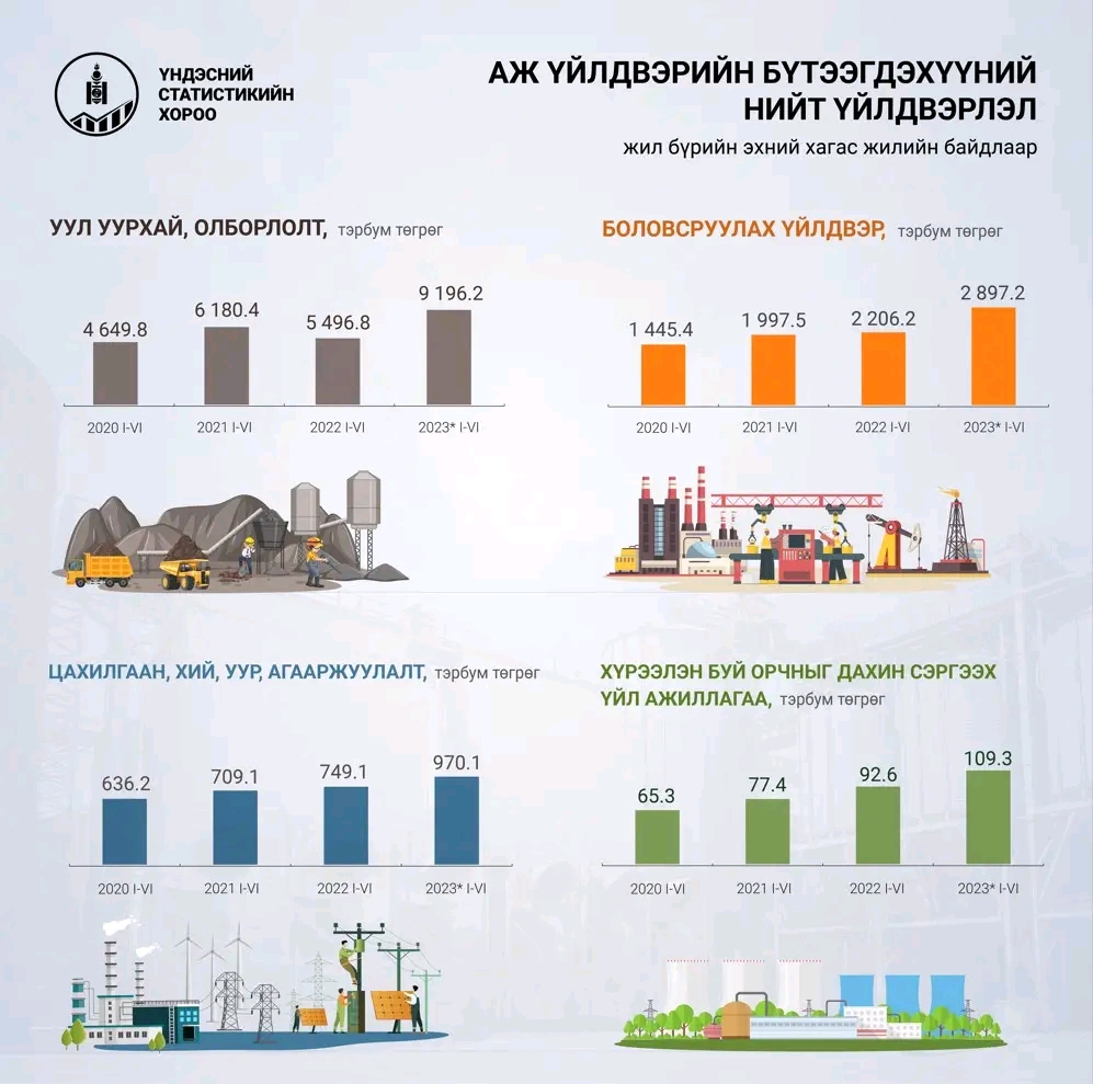 Аж үйлдвэрийн салбарын нийт үйлдвэрлэл 2023 оны эхний хагас жилийн урьдчилсан гүйцэтгэлээр 13.2 их наяд төгрөг болж, өмнөх оны мөн үеэс 4.6 (54.2%) их наяд төгрөгөөр өссөн байна.