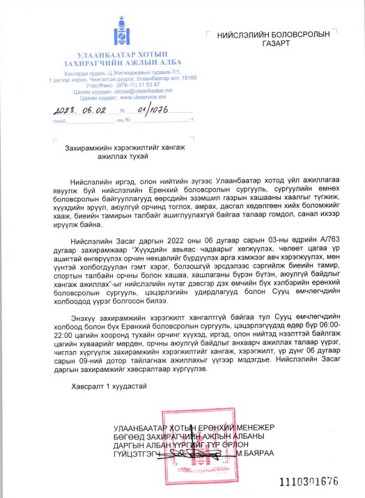 Уг нь өнгөрсөн зургаадугаар сард нийслэлийн Засаг даргын захирамжийн хэрэгжилтийг хангуулж, хүүхдийн авьяас чадварыг хөгжүүлэх, чөлөөт цагаа үр ашигтай өнгөрүүлэх орчин, нөхцөлийг бүрдүүлэх зорилгоор СӨХ, Ерөнхий боловсролын сургууль, цэцэрлэгүүдэд захирамжийн хэрэгжилт, үр дүнг тайлагнах талаар албан бичиг хүргүүлсэн ч байдал дээрдсэнгүй.