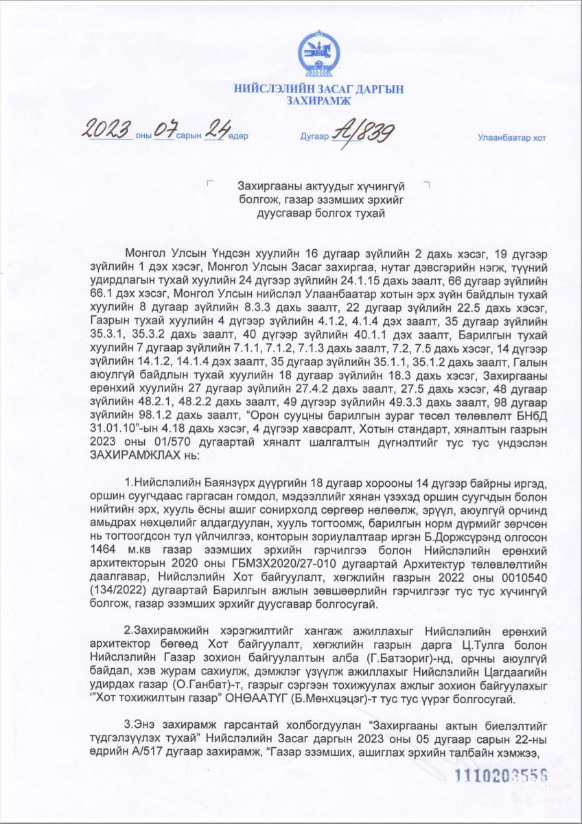 Баянзүрх дүүргийн 18-р хороо, 14-р байрны дэргэд баригдах гэж байсан барилгын "А" даалгавар, барилга барих зөвшөөрөл, газар эзэмших эрхийг Хотын даргын захирамжаар хуулийн дагуу хүчингүй болгожээ.