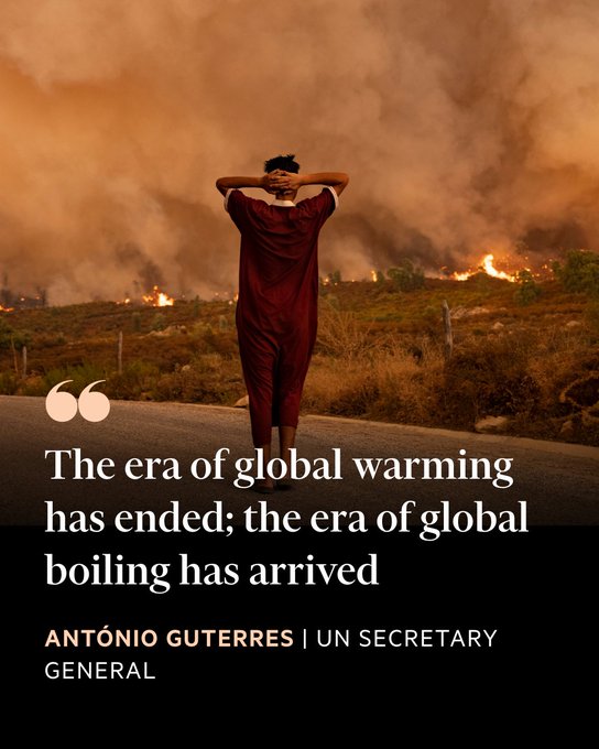 “Хойд Америк, Ази, Африк болон Европын ихэнх нутаг дэвсгэрт халуу шатаж байна. Энэ бол Дэлхийн хүн амын хувьд аюул юм. Эрдэмтэд хэт халалтын бурууг хүмүүсийн үйл ажиллагаатай холбон тайлбарлаж байгаа. Дэлхийн дулаарал айсуй тухай олон жилийн турш анхааруулсан. Гэвч дулаарал бидний тооцсоноос хурдан байна. Цаг уур маш хурдан өөрчлөгдлөө. Дэлхийн дулаарлын үе өнгөрч, одоо Дэлхийн хэт халалтын эрин үе эхэллээ.