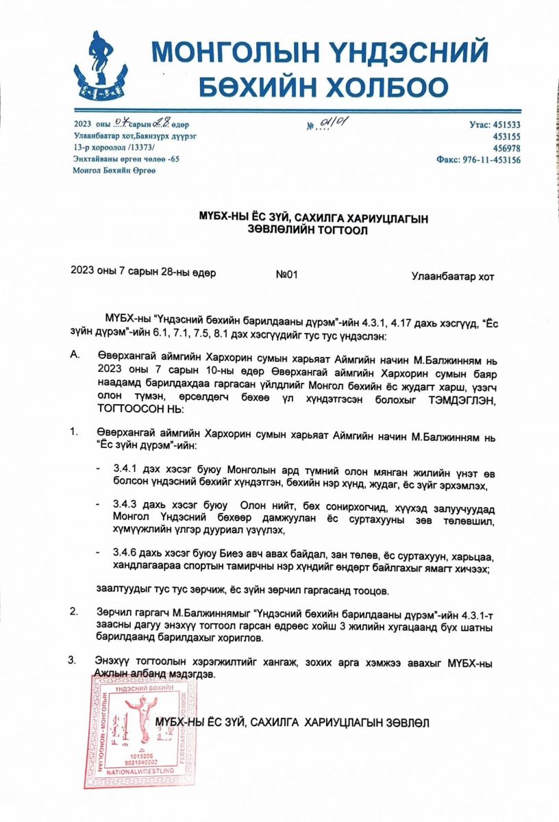 А. Өвөрхангай аймгийн Хархорин сумын харьяат, Аймгийн начин М.Балжинням нь 2023 оны долоодугаар сарын 10-ны өдөр Өвөрхангай аймгийн Хархорин сумын баяр наадамд барилдахдаа гаргасан үйлдлийг Монгол бөхийн ёс жудагт харш, үзэгч олон түмэн, өрсөлдөгч бөхөө үл хүндэтгэсэн болохыг ТЭМДЭГЛЭН, ТОГТООСОН НЬ: