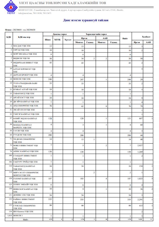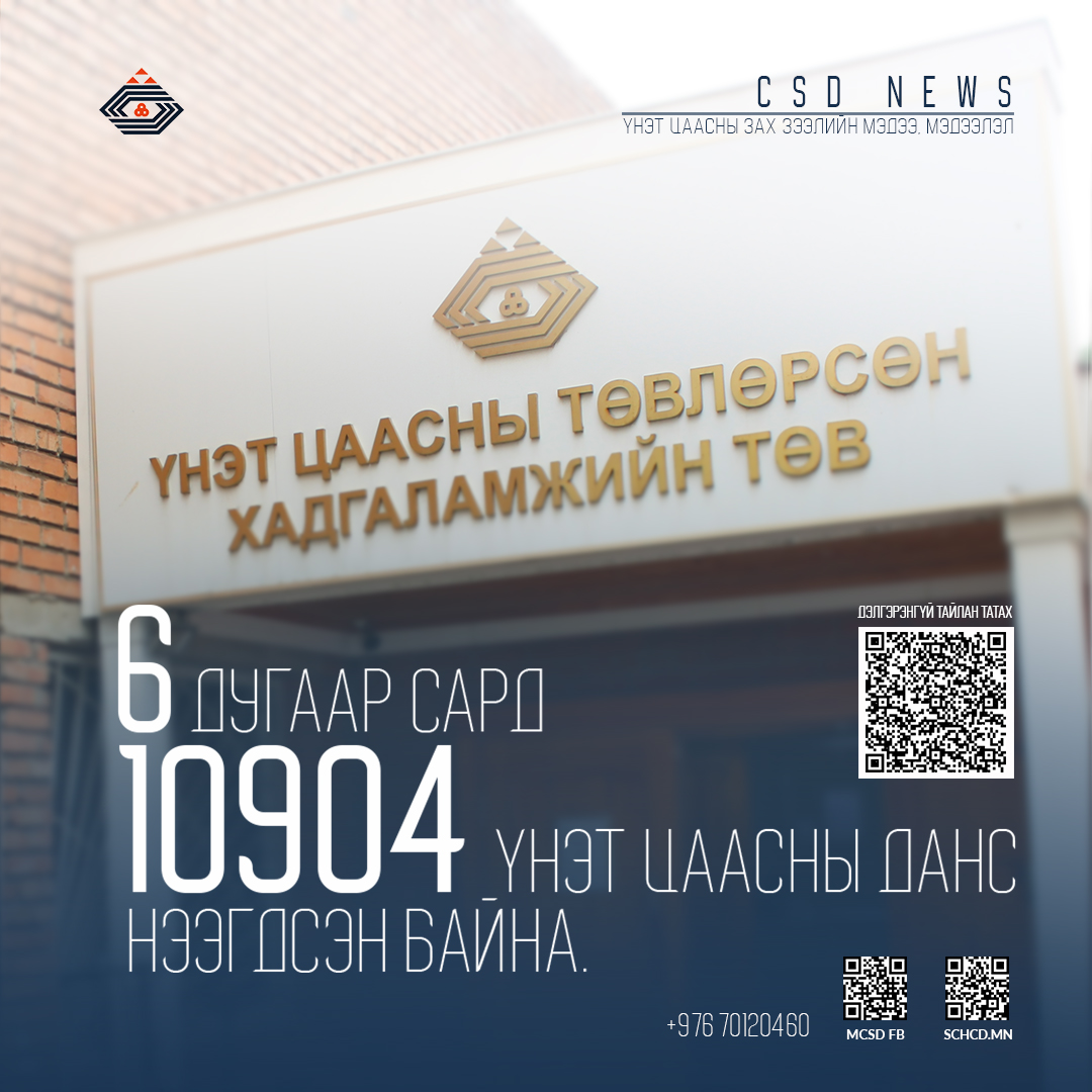 2023 оны зургуудагаар сард Үнэт цаасны төвлөрсөн хадгаламжийн төвд нийт 10904 данс нээгдсэнээс шинээр нээсэн 1735 данс, иргэний холболтын 9158 данс, аж ахуй нэгжийн 11 данс тус тус нээгдсэн байна.
