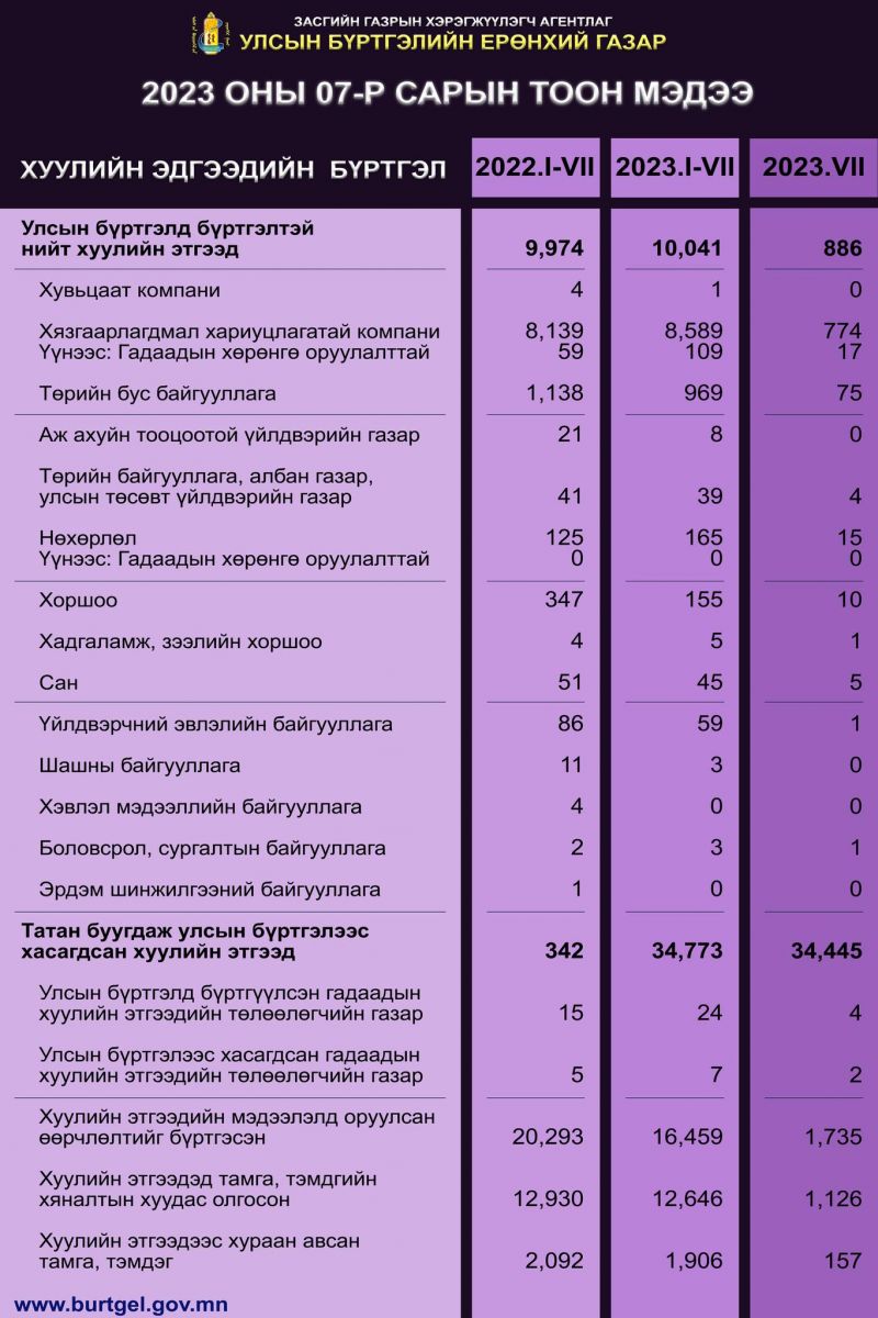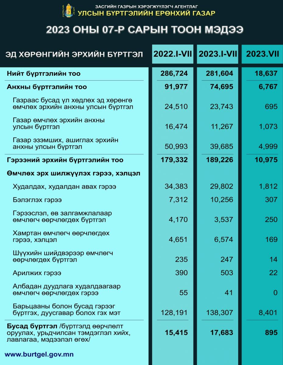 Улсын бүртгэлийн байгууллагын 2023 оны долоодугаар сарын тоон мэдээллийг танилцуулъя. Эх сурвалж: Улсын бүртгэлийн ерөнхий газар