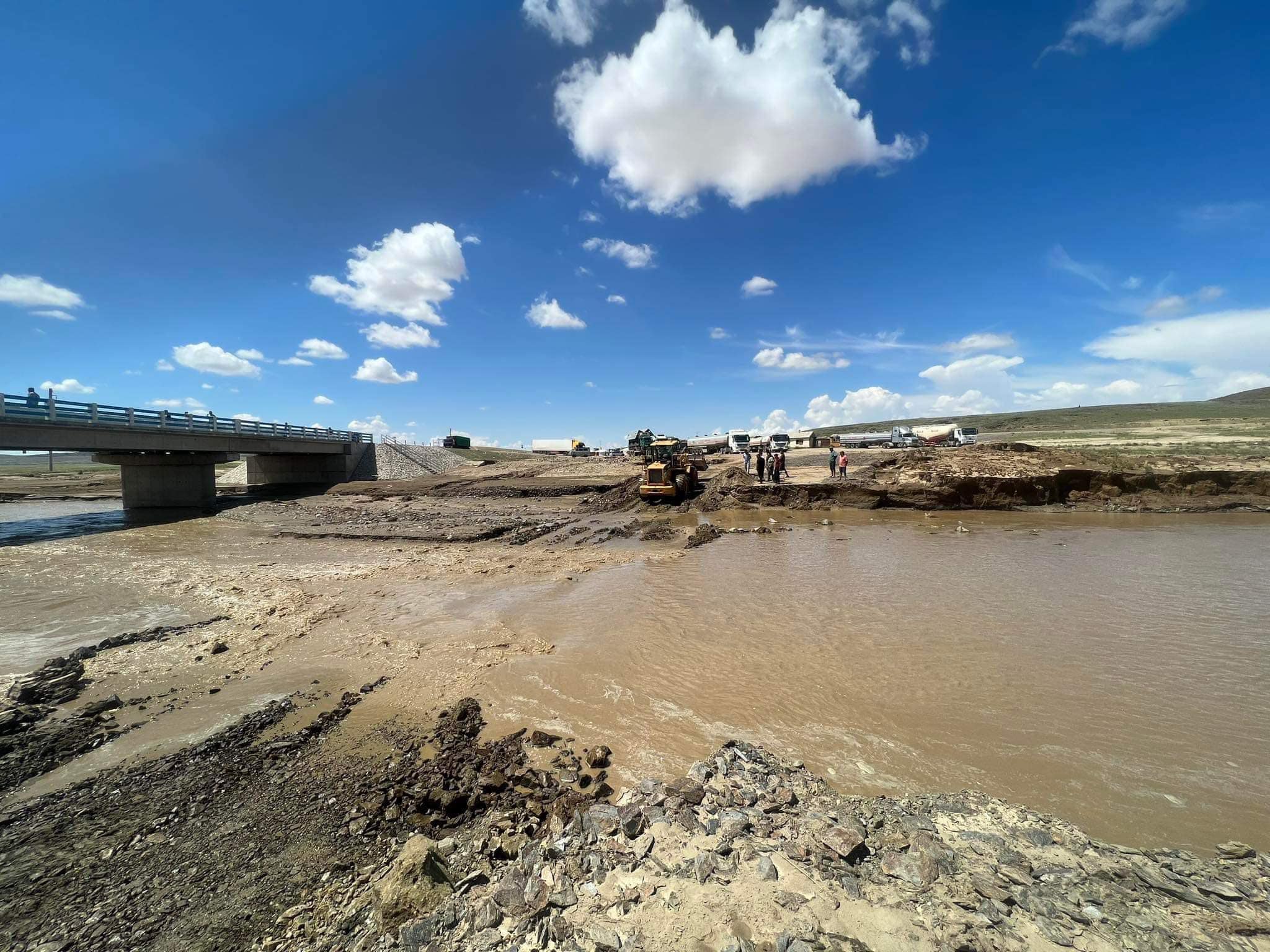 Хүчтэй үерийн улмаас Баянхонгор-Говь-Алтай чиглэлийн Нарийны гүүрний хоёр талын чулуун бэхэлгээ эвдэрснийг засаж байна. Хөвөө хучилтын ирмэгт тулж урссанаас болж авто замын зорчих хэсгийн хөрс нурсан тул авто машин зорчих боломж хязгаарлагдмал хэвээр байна.