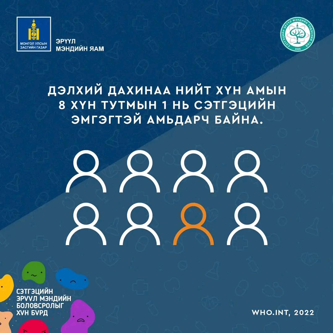 2019 оны тайлангаас үзэхэд дэлхий дахинаа 970 сая хүн буюу нийт хүн амын 8 хүн тутмын 1 нь сэтгэцийн эмгэгтэй амьдарч байна. Үүнээс хамгийн түгээмэл тохиолдох эмгэг нь Сэтгэл түгшилт, сэтгэл гутрал байна гэж ЭМЯ-наас мэдээллээ.