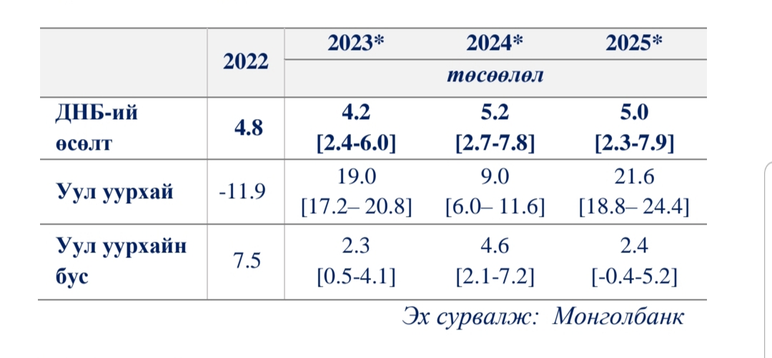 Монголбанк эдийн засгийн өсөлтийг 2023 онд 4.2 хувь, 2024 онд 5.2 хувь, 2025 онд 5.0 хувьд хүрэх тооцоололтой байна гэж инфляцын тайланд дурджээ.